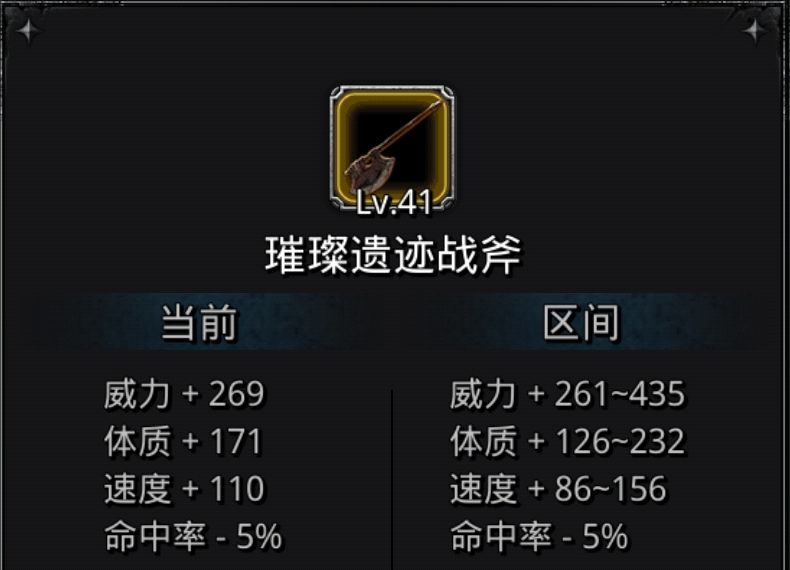 评价:因为它不给力量,减5%命中率被各城主嫌弃(看看隔壁璀璨法杖,斧子叹了口气),不过有一说一,前期璀璨斧还是挺强的,璀璨斧的威力高,高体质中速(撑分)在前期可以给城主带来不错的冒险收益,而且在有命中率确保之后还是可以用的,毕竟有能量增幅和武威撑着,伤害还是挺高,图16打破甲枪可能会用到,有了魔神斧和月斧后,璀璨斧子就没用了。
