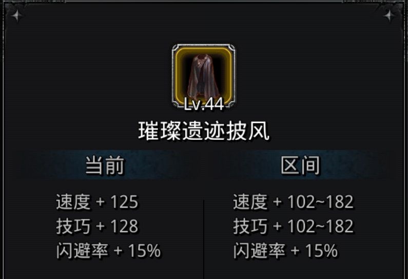评价:有着不错的技巧和速度,还有着15%的闪避率,特效急速给角色的提速效果也十分实用,闪避刺必不可少的饰品之一,个人认为,璀璨披风是一件前中期,(中间一段时间的实用性略低,可以用船长指环代替)大后期的饰品,可以利用其特效用来给前中期,后期夜魇提升输出,可以为后期闪避刺的成型带来不错的收益,以及大后期遗迹9,战力测试的带来的力速比提升(提升速度,压低力速比)。