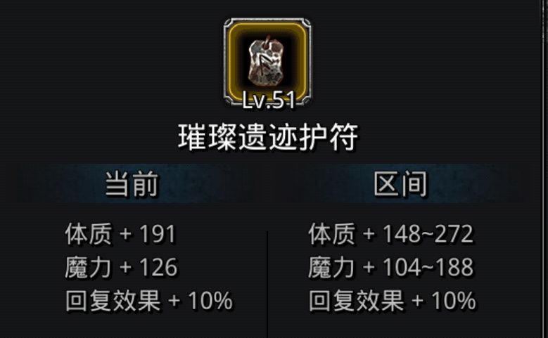 评价:高体质中魔力还有10%的回复效果,以及特效庇护(仅限于物理受击概率回复生命值),璀璨护符与圣骑士的相性很好,能奶能抗(做主t要一定的护甲值,不然血在高仍然没用),当然也可以给祭祀or法师用来提升生存率,前期用处挺大,毕竟前期一个王国戒不够用,建议骑士配护符,祭祀配吊坠,后期迷雾岛拿了两条腰带和命运之轮(通关裂隙53后获得)后,护符的使命基本就结束了。