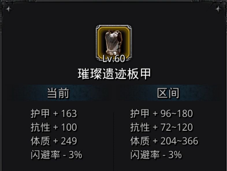 璀璨遗迹板甲:高甲中抗高体,特效格挡(力量越高触发的护甲增益越高),前中期实用性极高,对推图,裂隙,遗迹的收益很高,一般给物理输出性职业(龙猎一般穿法袍,毕竟龙族一般都是魔法攻击)