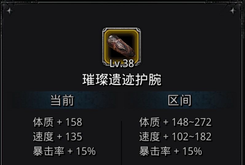 tip:关于璀璨遗迹护腕&冥骨风暴号角的性价比:本人认为:冥骨风暴号角>璀璨遗迹护腕,号角有中速中体高力,而且比护腕多了5%暴击,后期有璀璨铠甲撑体质,护腕高体带来的收益就不是很高了。