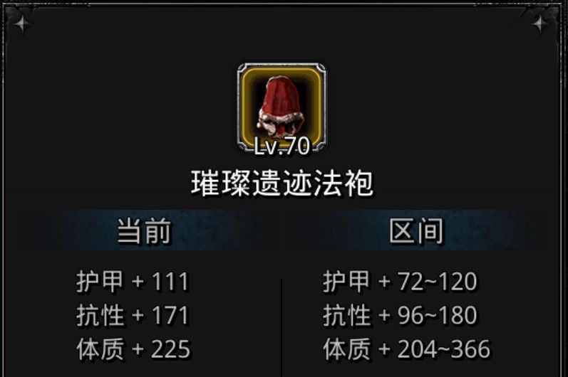 璀璨遗迹法袍:中甲高抗高体,特效魔法盾(魔法越高触发的抗性收益越高),收益同璀璨板甲,一般给法系输出。