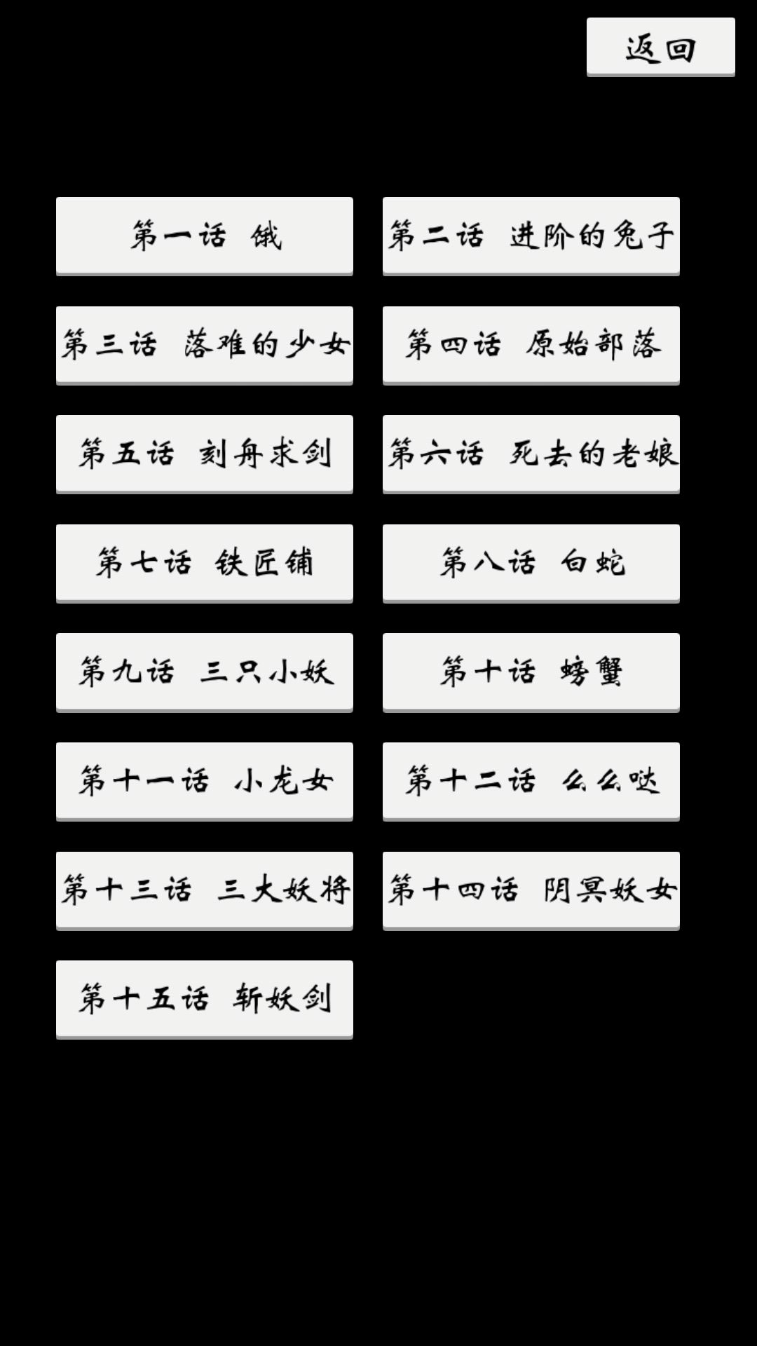 攻略:第一关 拿照妖镜照兔妖 第二关 拿照妖镜,在物品栏持续点击照妖镜,点出碎片,刺兔妖 第三关 对话结束后,点击右下角骷髅堆,拿到斧子,砍树妖,快速点击对话,在倒计时结束之前完成 第四关 和右边狮子部落对话,拿到刀,砍牌子上的猫 第五关 对话选不是,得到匕首,在守剑人脚偏左下刻痕 第六关 到右侧点兔子和红花,得到肉和毒,结合得到毒肉,和假老娘对话,得到封印剑 第七关 将剑交给铁匠,得到戒指,给梓言,得到花,给铁匠,得到剑 第八关 点击菜单,下一关 第九关 留下那个不想死的妖怪 第十关 给渔夫捉螃蟹,我捉了100多个,尽量多捉 第十一关 到海底,说有急用(玩到这心情复杂) 第十二关 输入我爱你!(叹号不能少) 第十三关 第一个揭符,第二个怪能挪走,得到一昧真火,长按得到第二个,再长按得到第三个,第三个怪点击月亮,得到太阳,安到月亮位置 第十四关 选砍她,得到三元经 第十五关 把东西都给师傅
