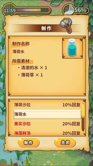 炸开巨石之后,来到湖泊区域,使用空瓶(可以在海岸、湖泊区域捡到)在湖泊区域左边处或森林的右下角处的水池里装上水,然后与薄荷草一起做成驱赶蝙蝠用的薄荷水。