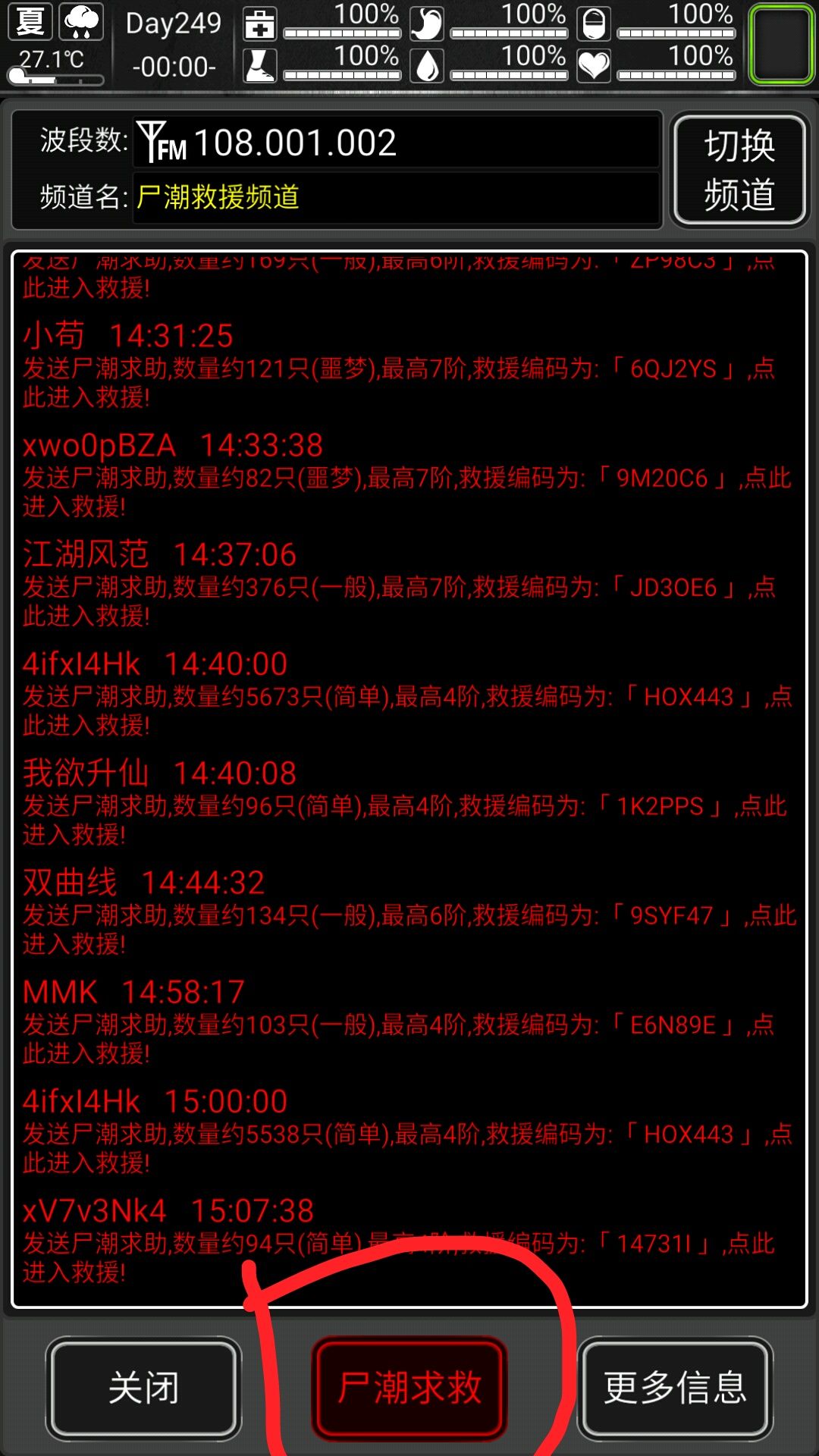 尸潮求救:尸潮来了点击电台点击聊天中间有个红色的,只有来尸潮才可以求救,自己打尸潮要到地图上。。每日貌似只能发一次不然要等8小时。。