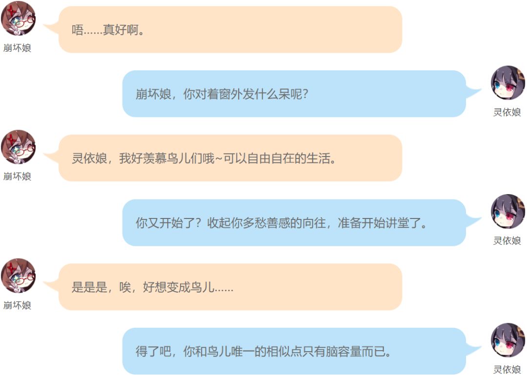 原来,托托莉失踪的原因正是为了牵制温蒂的行为。虽然两人以伙伴相称,但归根结底,律者始终是异于人类的存在,其喜怒无常的性格和随心所欲地的行为都可能造成巨大的灾难。在察觉到崩坏能的骤变后,可可利亚当即展开了作战,将托托莉脱离了律者的身边。然而在温蒂眼里,这却仿佛只是一场突如其来的捉迷藏一般,她轻而易举地便突破了防线,掀起狂风吹翻障碍,并直取夺走托托莉的宁蒂。为了阻止温蒂继续造成破坏,托托莉毅然拦在了温蒂的面前。在其恳求之下,温蒂像是被爽约了的孩子一般扫兴地停止了追逐。她不高兴地煽动翅膀,留下对托托莉的叮嘱飞离了这片区域。