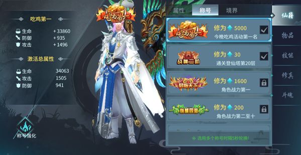 仙籍内主要查看的是角色的属性情况,个人称号以及目前的境界。称号内可以选用多个称号,在游戏时每隔5秒会轮换一个称号,提升战力的同时向他人展示你的个性称号,十分酷炫!