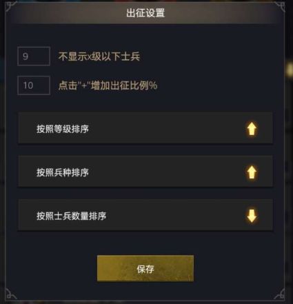 根据每位玩家各自的偏好可自行设置显示士兵限制(如图所示,当输入数字为“9”时则出征时不显示9级以下的士兵)、增加出征比例(填数字10则在出征页面内每点击一次“+”对应的士兵数量增加出征上限的10%)和士兵排序(等级、兵种、士兵数量)。个性化设置方便每一位玩家结合自身游戏习惯进行操作,大大提升了游戏体验。