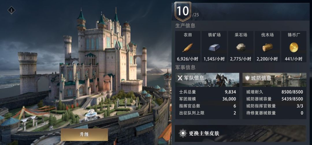 在五种基础资源中,最重要的便是粮食了,因为领主们所训练的士兵每小时会消耗一定的军饷,消耗量一旦超出产量,领主们便需要花费更多精力通过其他方式来获取粮食。金币因为获取方式多,使用频繁,所以也需要保证一定数量的供应。其他三种资源主要用于建筑升级,维持基本用量即可。