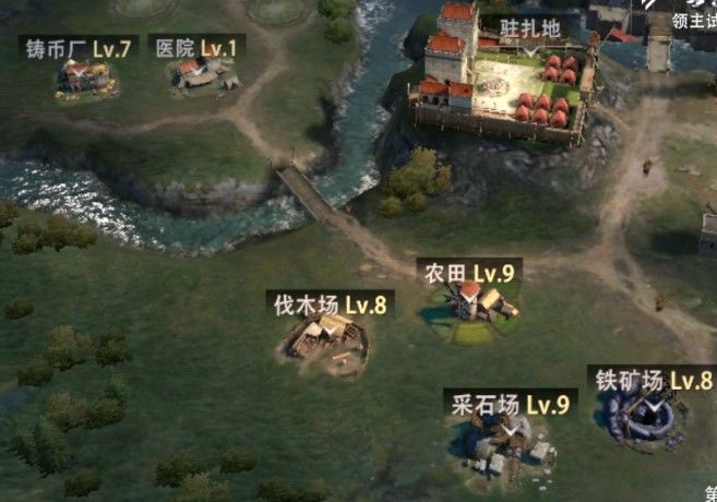 领主到达一定等级后,便可以在城堡外挑战叛军首领,以获得军事用地。随着领主等级的提高,叛军首领的血量也在不断提高,领主战胜他们获得的军事用地的数量也会更多。军事用地总共有22块,领主可以在上面建造农田、采石厂、伐木场、铁矿厂、铸币厂、兵营以及医院七种建筑,而兵营和医院在主堡附近各有一个,因此,在前期我们可以减少兵营和医院的数量,而尽多的将军事用地分配给基础资源厂。