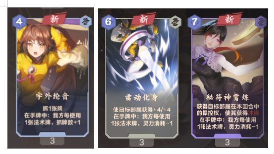 在手牌中时,如果触发效果,就能减少本身这张牌的灵力消耗,属于“节流”的效果。雷属性减耗牌比较多,且大多跟法术使用相关。