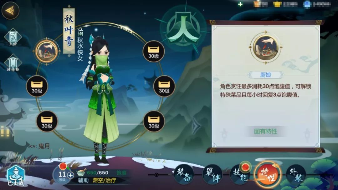 知道3妹为什么厨艺突飞猛进吗?因为这次请了好帮手——秋叶青。秋叶青小姐姐的“厨娘”效果很强,角色烹饪最多消耗30点饱腹值,可解锁特殊菜品且每小时回复3点饱腹值。少侠们如果对厨艺不自信,可以拉上她一起烹饪哦~