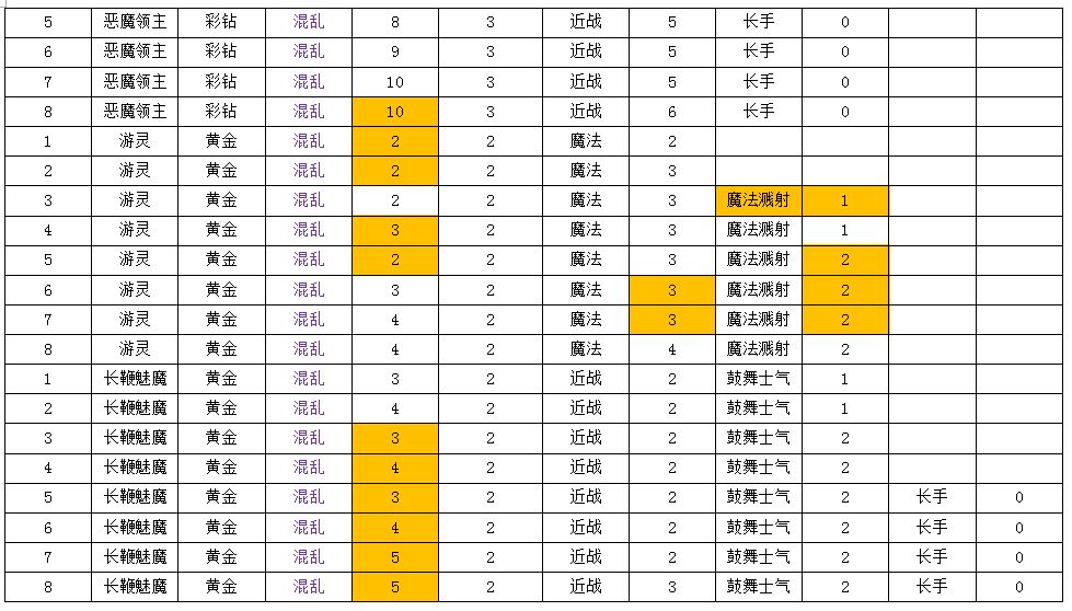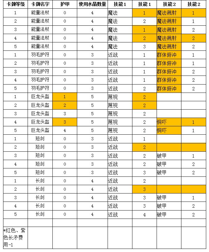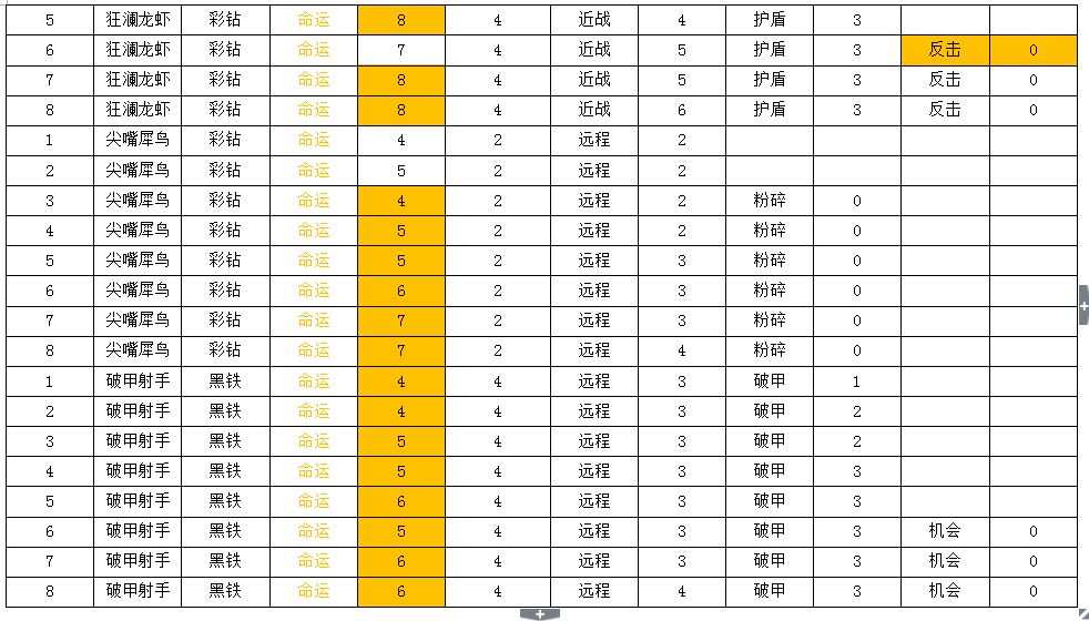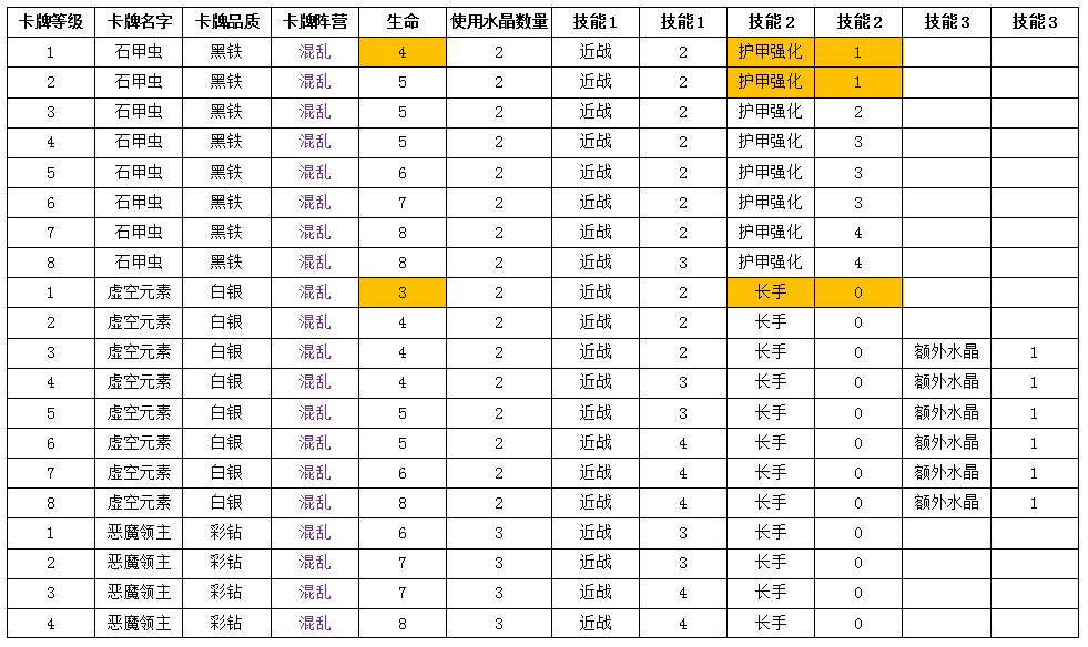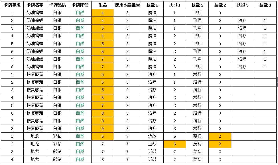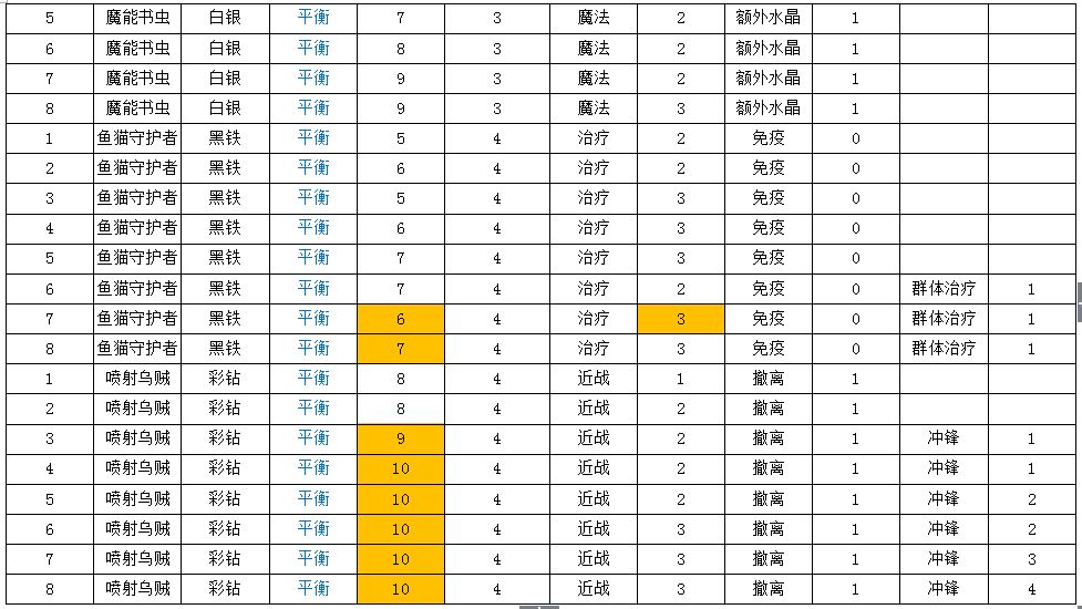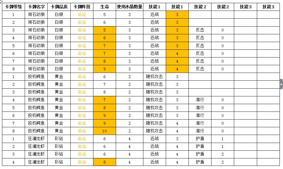 表中桔色高亮部分为变动过的数值,本次数值调整包括之前玩家投票加强的狂澜龙虾、奶油蝙蝠。