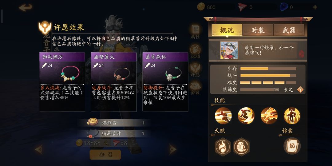 前期先找齐5个矿把武器升级到橙色在打架,许愿推荐闪避回血,可以大大的提升龙音子的生存能力。