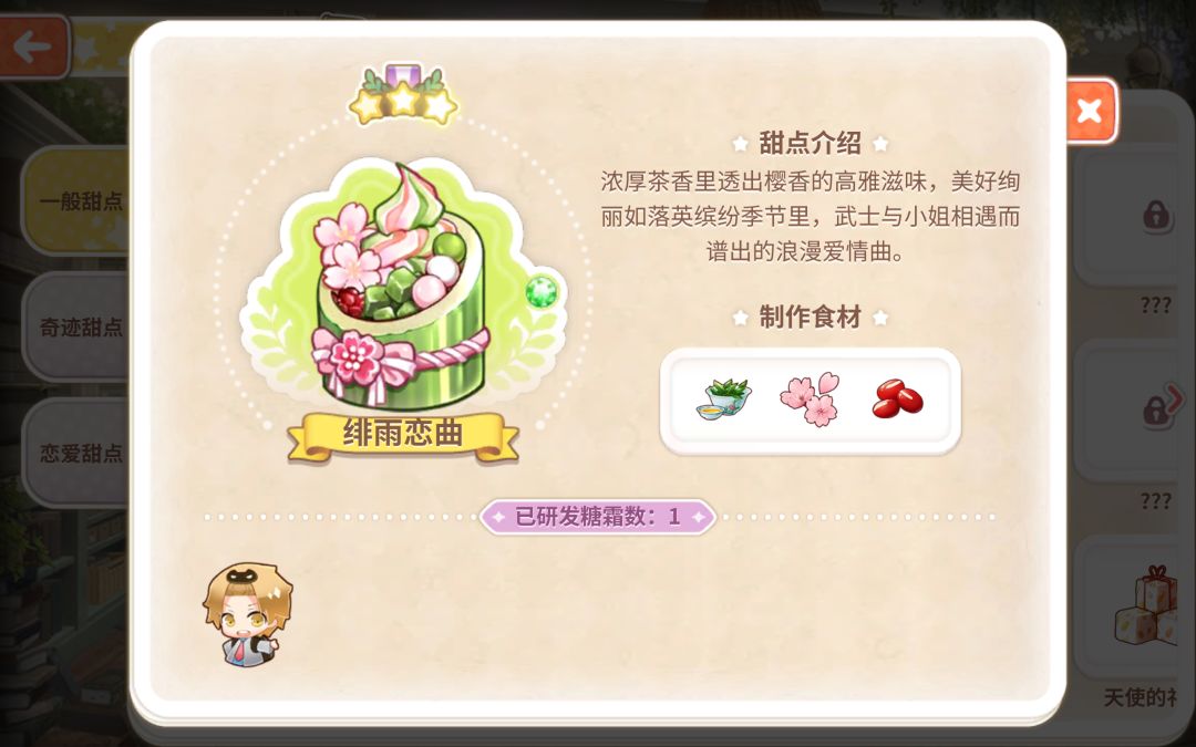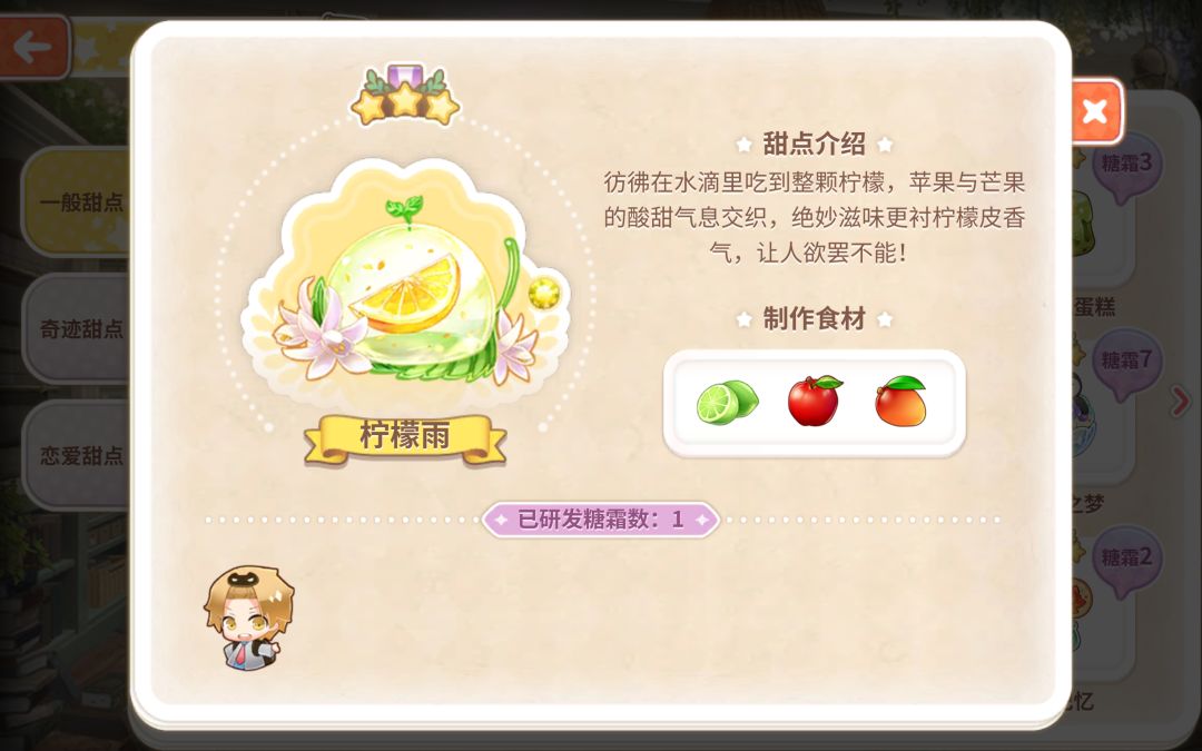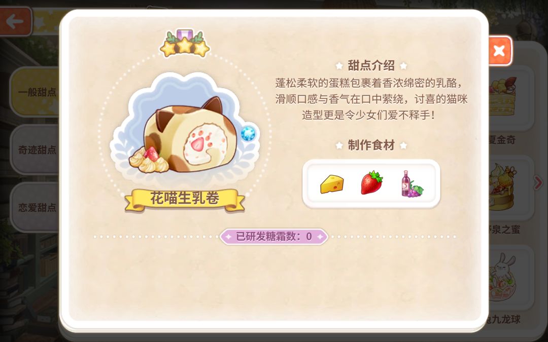 我想出里柏尔糖霜,首先得聘请他成为甜点师。之后嘛,甜品必须三星。都具备了就点【糖霜研发】