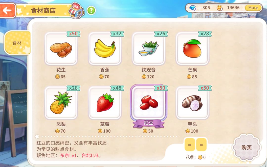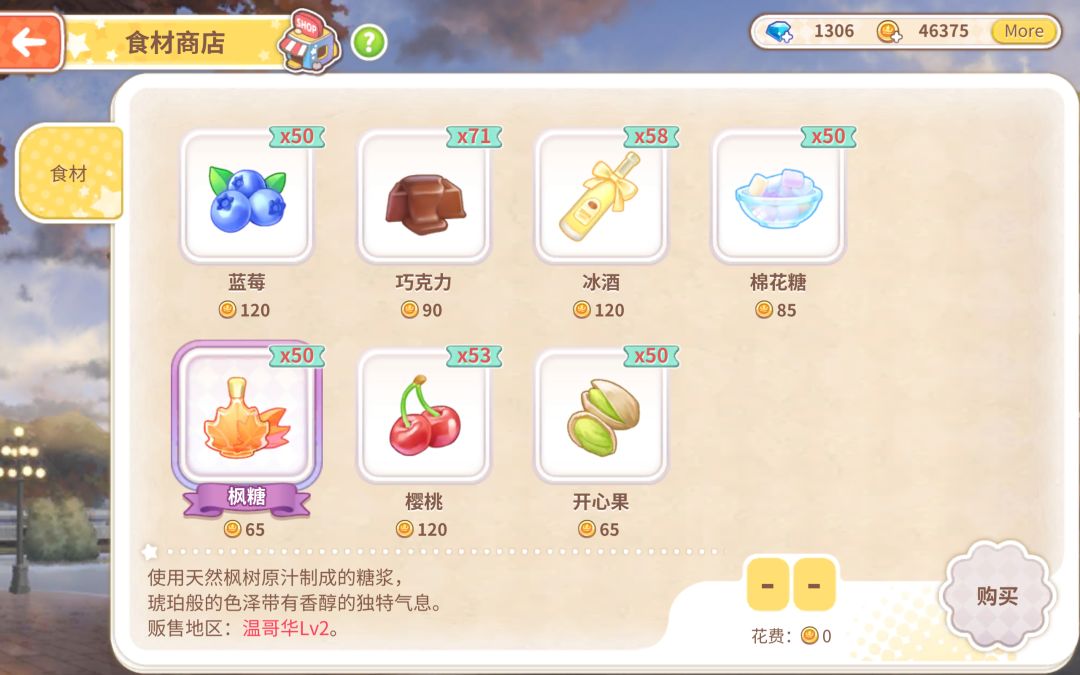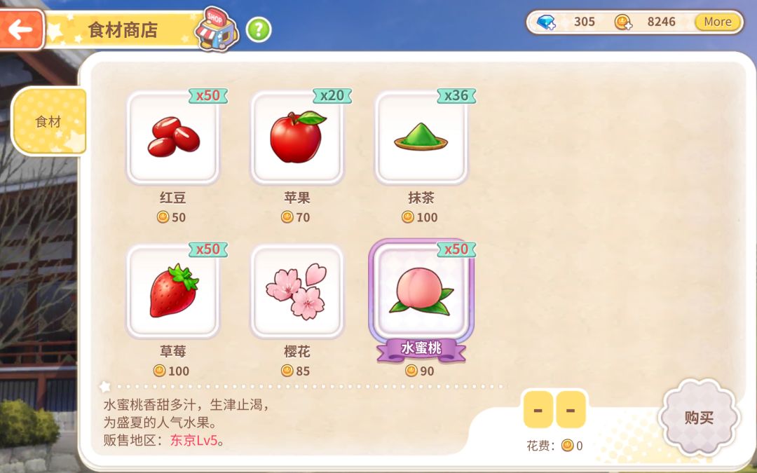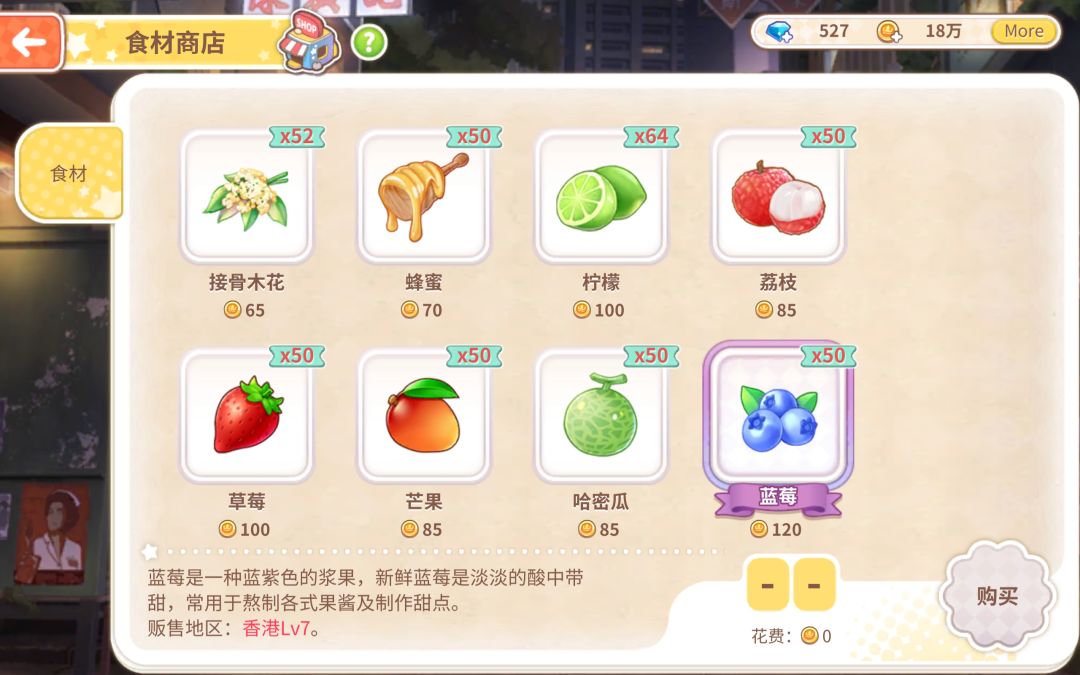 首先请增加食材上限,30和50还是差很多的,因为像樱花、抹茶、芋头这些很贵或者很常用的食材请男主采买的时候根本不会拿到,可是它们又用很快,所以只能自己飞去买。汽油好像10分钟一点吧,每天还要飞两次做城镇任务,所以要精打细算。