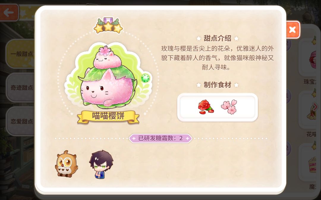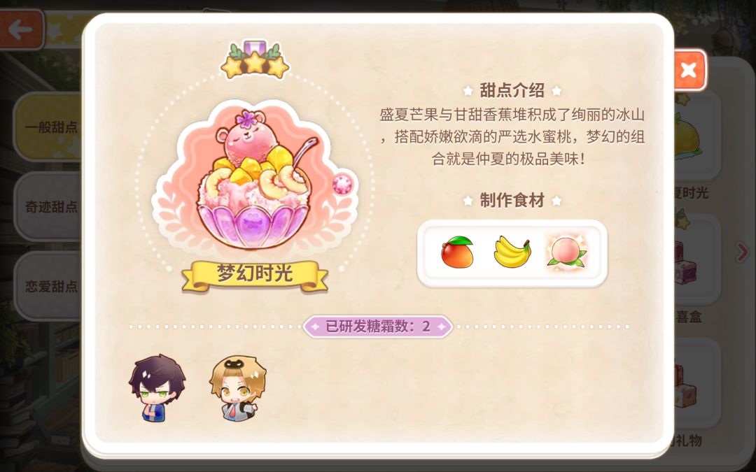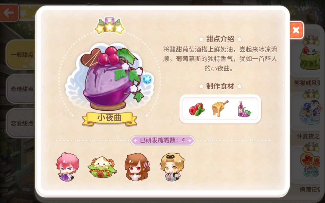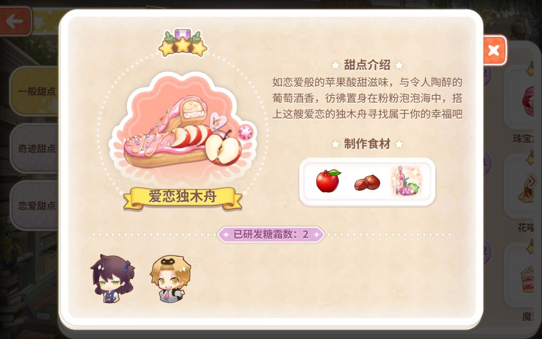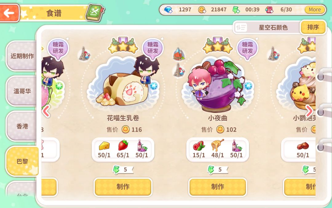 烘焙台:初始自带,没什么可说的。点一下女主和甜点师会自己跑过去,人齐了就会蹦出菜谱页面。