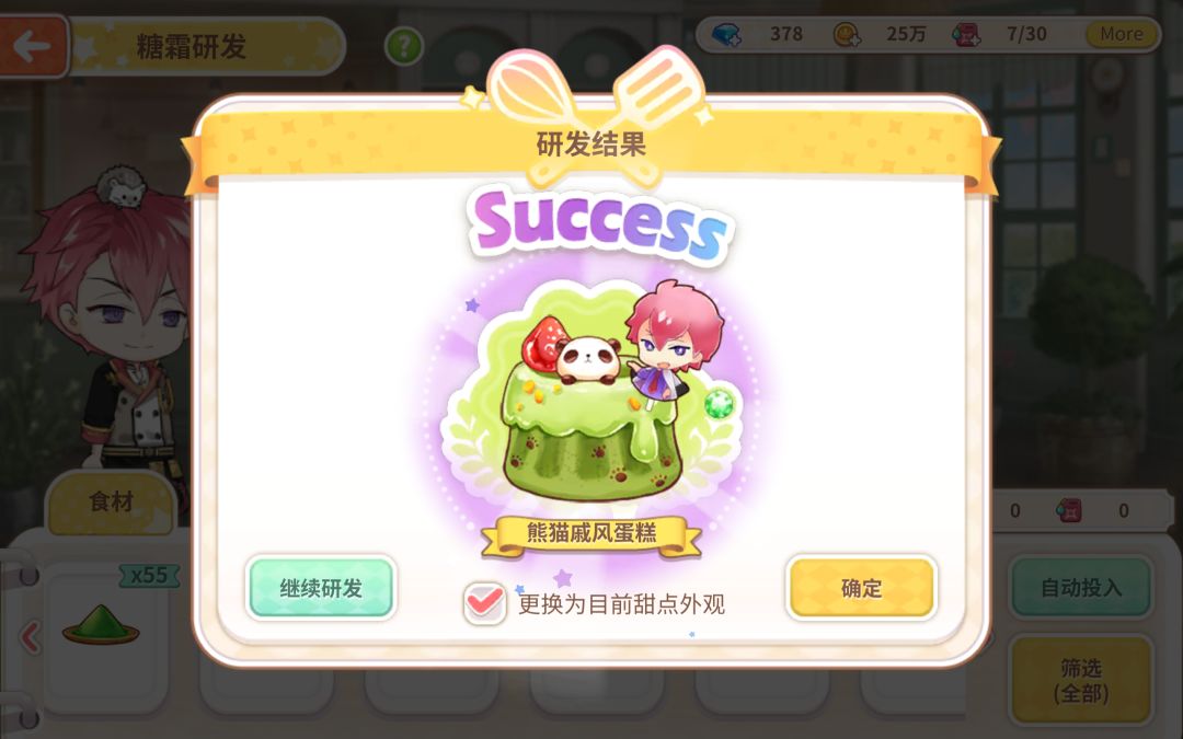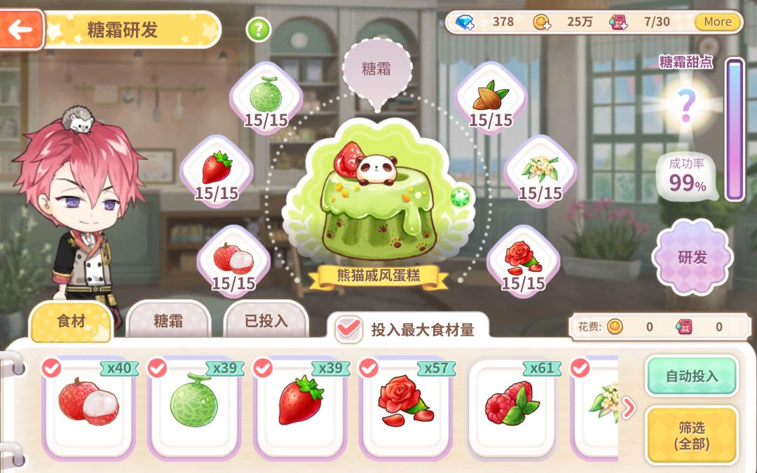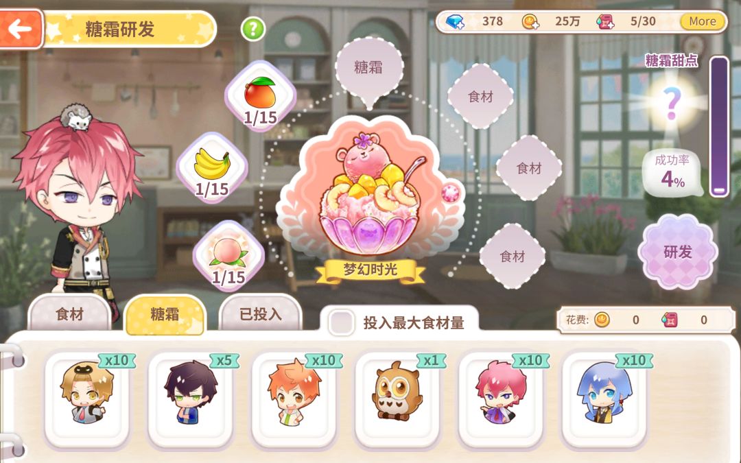 开玩笑,不是一步到位的,中间出了两次猫头鹰,但是结果还是不错的。我之前给【绯雨恋曲】刷伊恩糖霜的时候,按照习惯选最便宜的,连续6次都没出伊恩。联想到官方说“研发出的糖霜甜点也会因为担任的甜品师和食材组合不同,研发出不同的糖霜”,意思应该是说(在菜谱本身固有的食材基础上+某些选择性的食材组合)*概率=我们想要的人物糖霜。一般来说【自动投入】3次大多会出现自己想要的糖霜啦。这个东西急不得的,毕竟45*9……