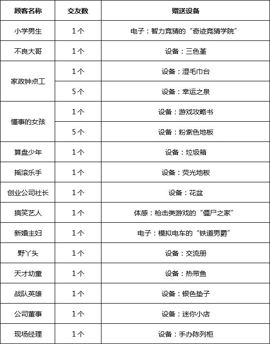在《游戏厅物语》中,我们需要开发不同类型的游戏机和各种设备来满足店内顾客的要求。都说“顾客就是上帝”,而来到我们游戏厅的顾客居然会大方的送设备、服务等给我们!赶紧来看看都是哪些顾客这么好心吧。