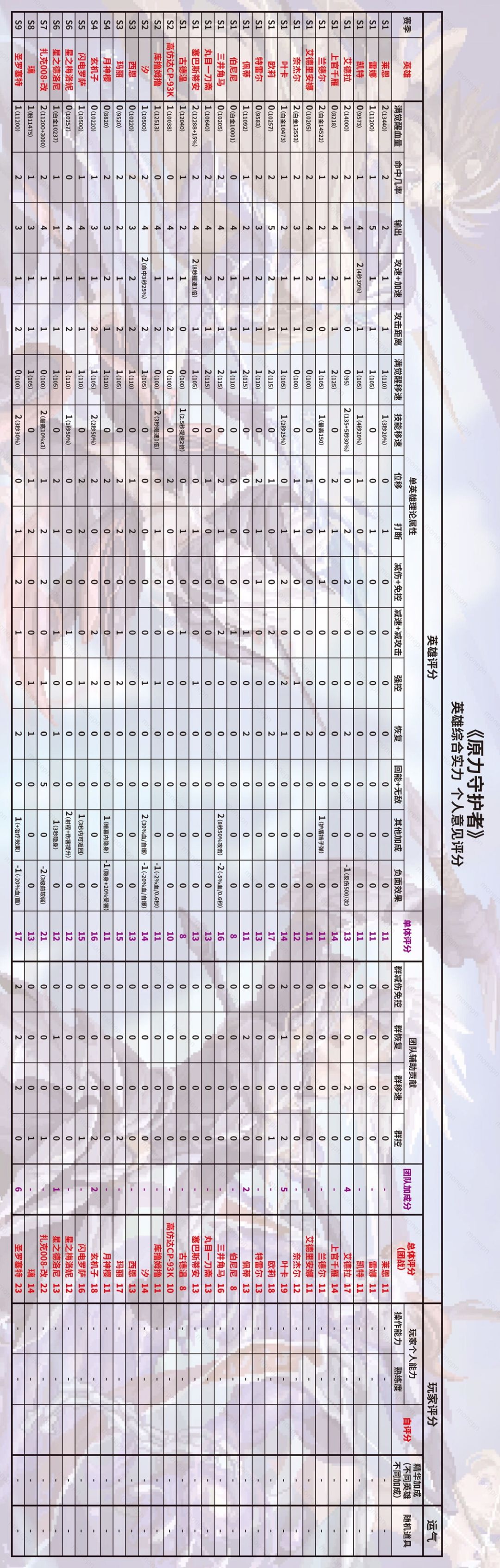 首先感谢官方团队,每个赛季都在不断出新英雄,而且英雄的可玩性也越来越多,下面先分享一张比较简单又全面的英雄评分表,这张表一共讲到四个方面,第一部分是对于单个英雄特点的一些评分,第二部分主要是介绍英雄在团队中的辅助分,第三部分是玩家对英雄的运用能力,最后部分讲的是随机道具(人品类,有啥用啥)。这里主要讲到的是前两个部分,只有全面的英雄才能获得更高的评分,但是目前这个游戏的模式太少,很多英雄不能发挥其真正能力,所以只要抓几个模式需要的大特点即可,不需要这么综合性的评分。