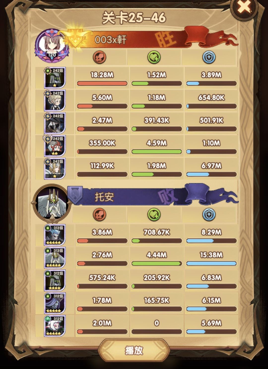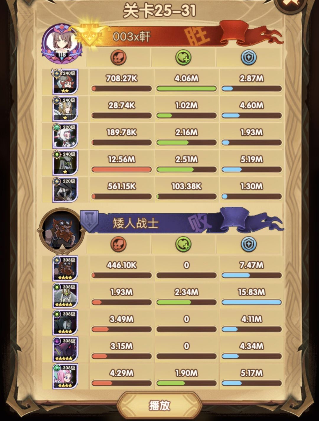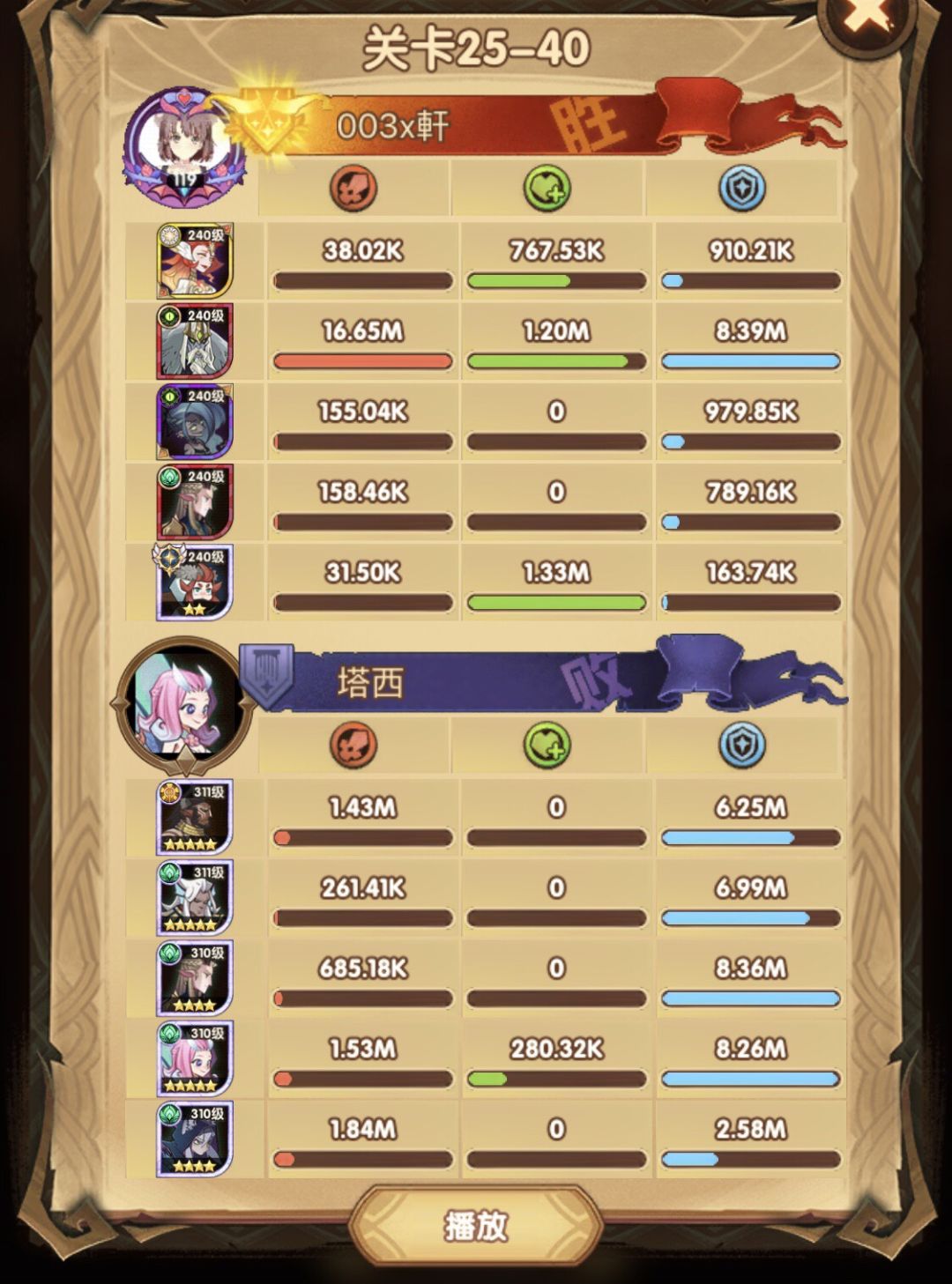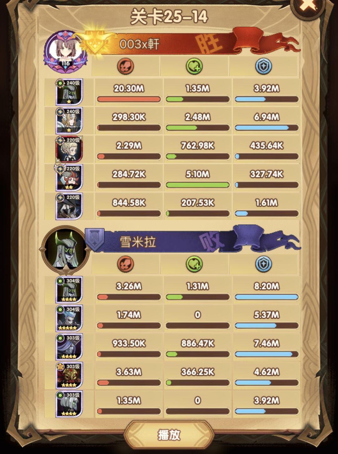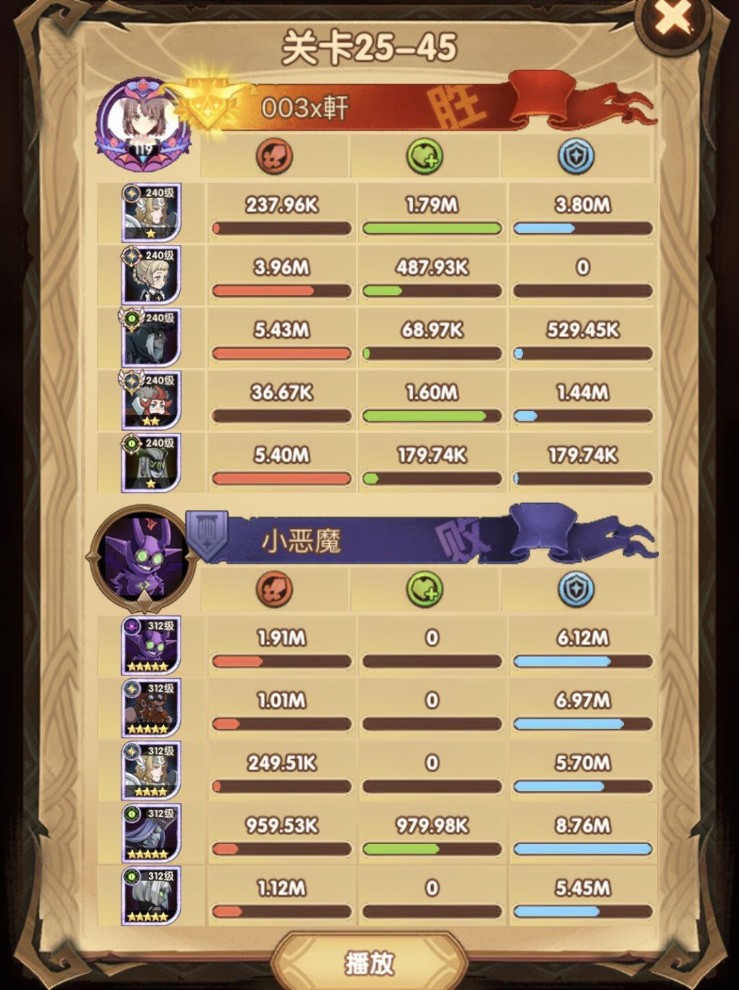 25-46 两天前其实就到全队240,还能升两级的但是我压着等级没升,想试试女妖全队240到底能不能过25章,但re了两三天之后还是只能推到-46,而且也没去更新,女仆也没有+20,女妖的输出真的一言难尽,女妖队,女妖骨弓,骨弓凤凰魅魔,很多方法很多阵容我都试过了并且都re了很久,最好的情况都是差一点点一点点,骨弓是打到时间结束差一点打不死,看的人也是很难受😂,这两天一天平均到8小时的re,甚至于更多,上周末有到十几个小时,所以我真的是尽力了,当然也很有可能是我自身能力不足,但我在我的目前情况下基本是尝试到最极限了,后面就慢慢升级着打了,如果没能达到大家的期望也只能抱歉了,这个头发日渐稀少的楼主尽力了😭