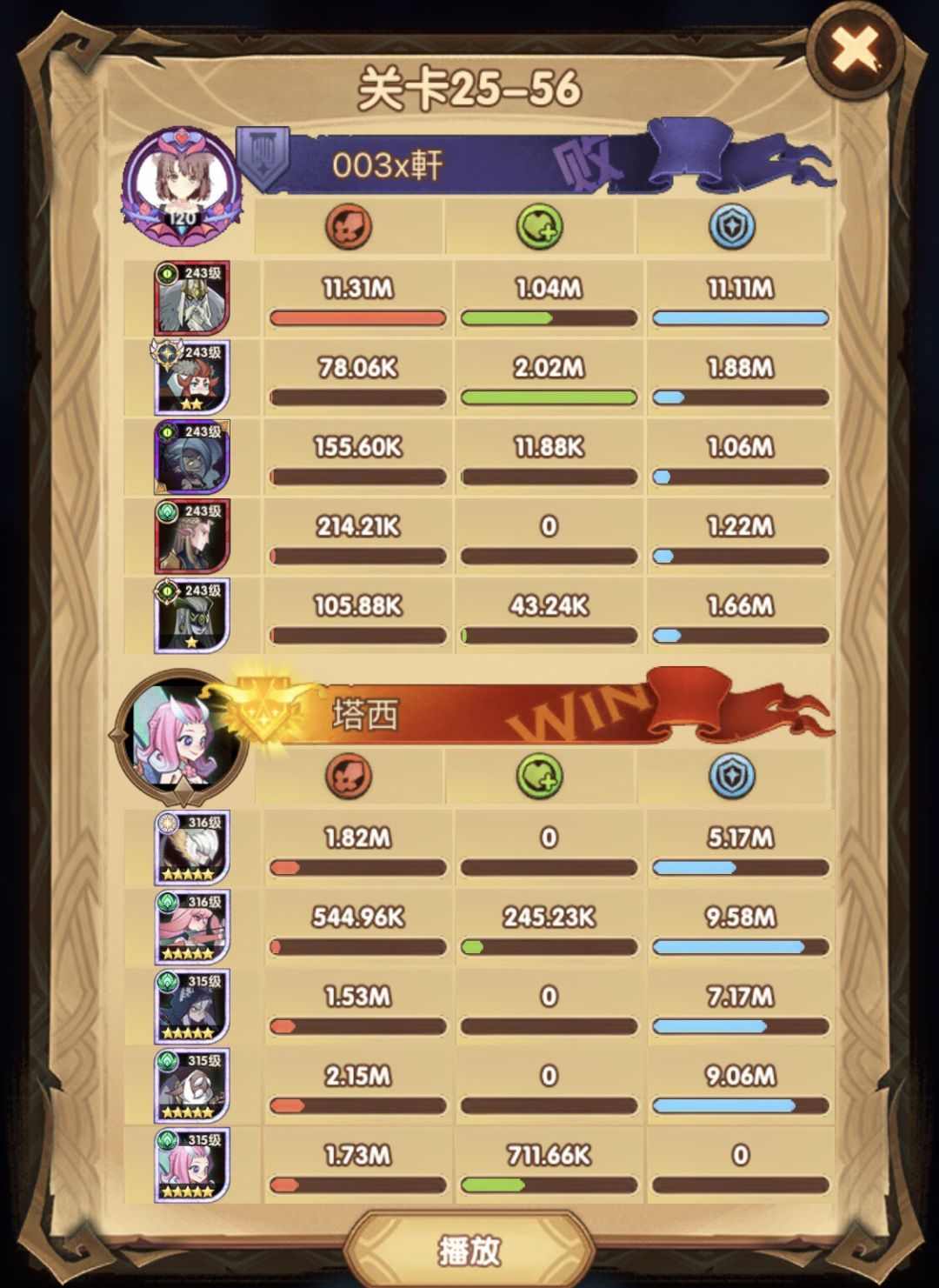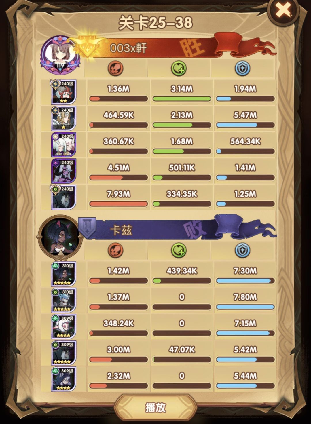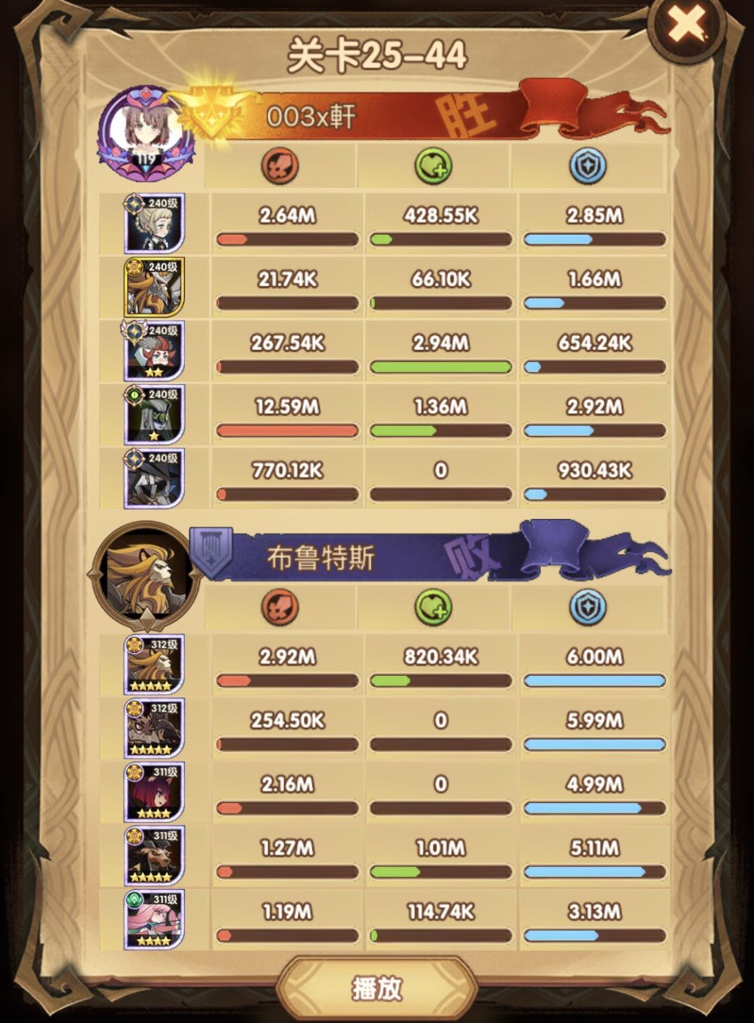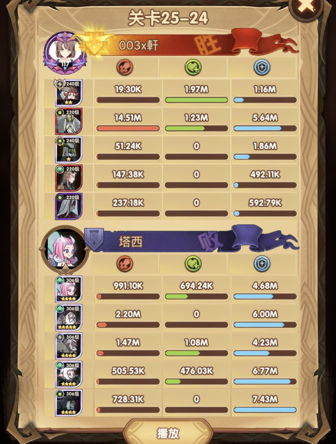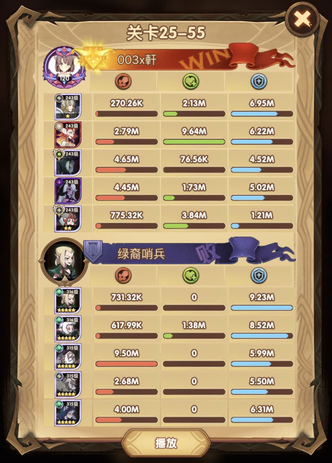 25-46 两天前其实就到全队240,还能升两级的但是我压着等级没升,想试试女妖全队240到底能不能过25章,但re了两三天之后还是只能推到-46,而且也没去更新,女仆也没有+20,女妖的输出真的一言难尽,女妖队,女妖骨弓,骨弓凤凰魅魔,很多方法很多阵容我都试过了并且都re了很久,最好的情况都是差一点点一点点,骨弓是打到时间结束差一点打不死,看的人也是很难受😂,这两天一天平均到8小时的re,甚至于更多,上周末有到十几个小时,所以我真的是尽力了,当然也很有可能是我自身能力不足,但我在我的目前情况下基本是尝试到最极限了,后面就慢慢升级着打了,如果没能达到大家的期望也只能抱歉了,这个头发日渐稀少的楼主尽力了😭