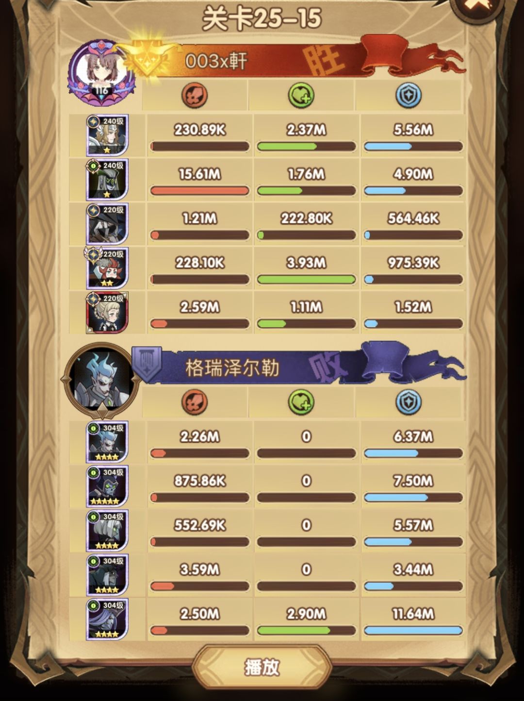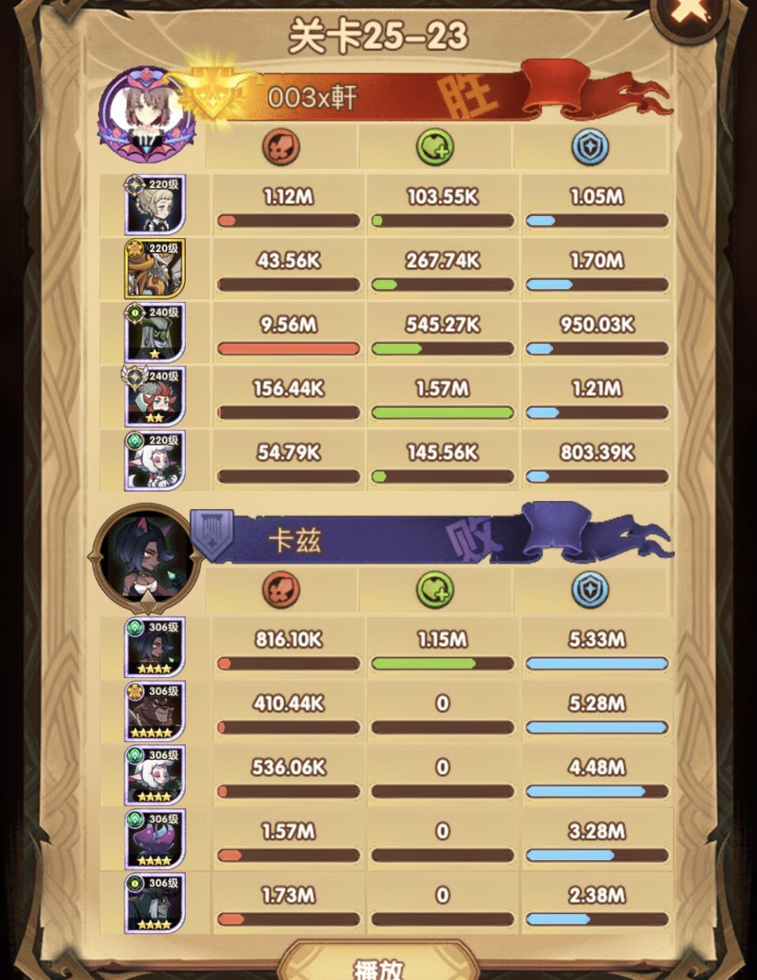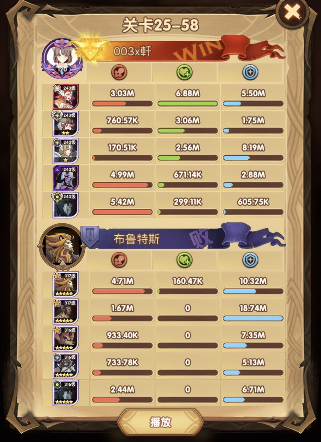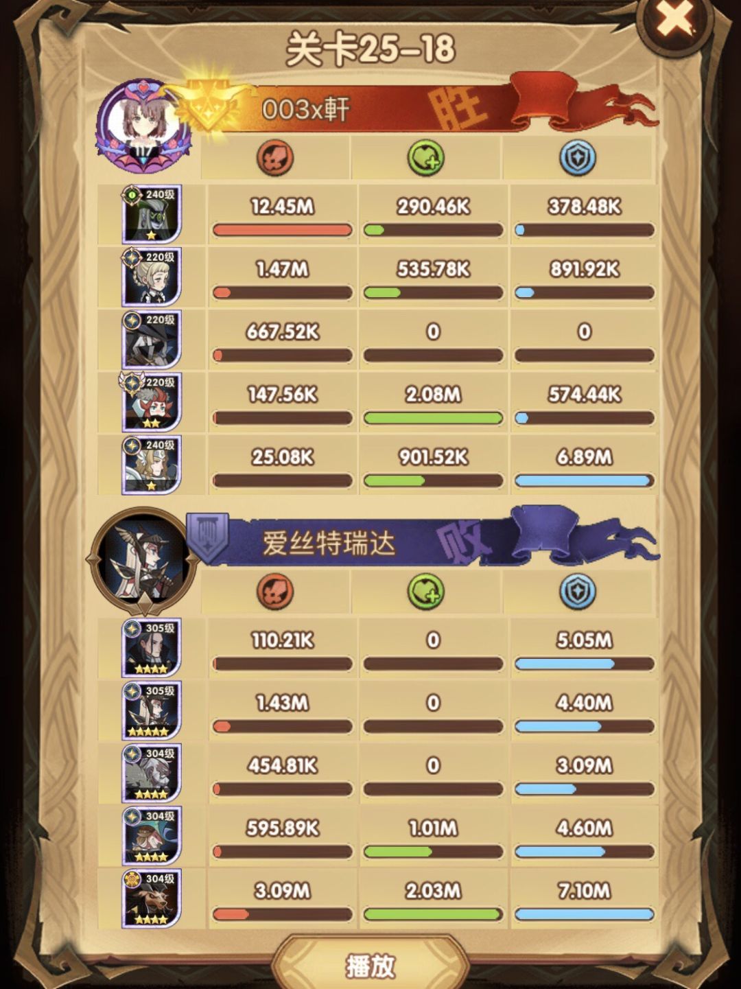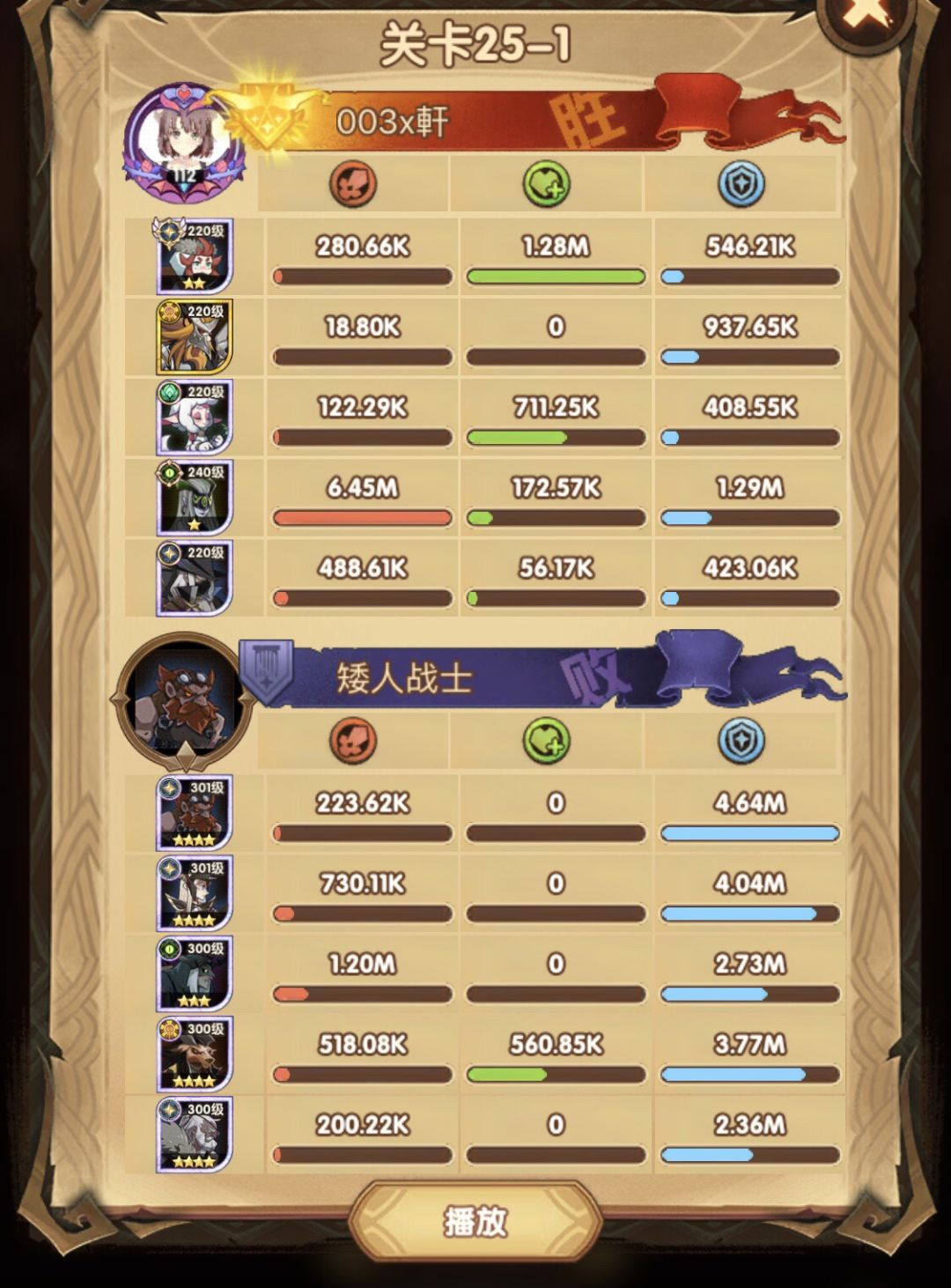 25-46 两天前其实就到全队240,还能升两级的但是我压着等级没升,想试试女妖全队240到底能不能过25章,但re了两三天之后还是只能推到-46,而且也没去更新,女仆也没有+20,女妖的输出真的一言难尽,女妖队,女妖骨弓,骨弓凤凰魅魔,很多方法很多阵容我都试过了并且都re了很久,最好的情况都是差一点点一点点,骨弓是打到时间结束差一点打不死,看的人也是很难受😂,这两天一天平均到8小时的re,甚至于更多,上周末有到十几个小时,所以我真的是尽力了,当然也很有可能是我自身能力不足,但我在我的目前情况下基本是尝试到最极限了,后面就慢慢升级着打了,如果没能达到大家的期望也只能抱歉了,这个头发日渐稀少的楼主尽力了😭