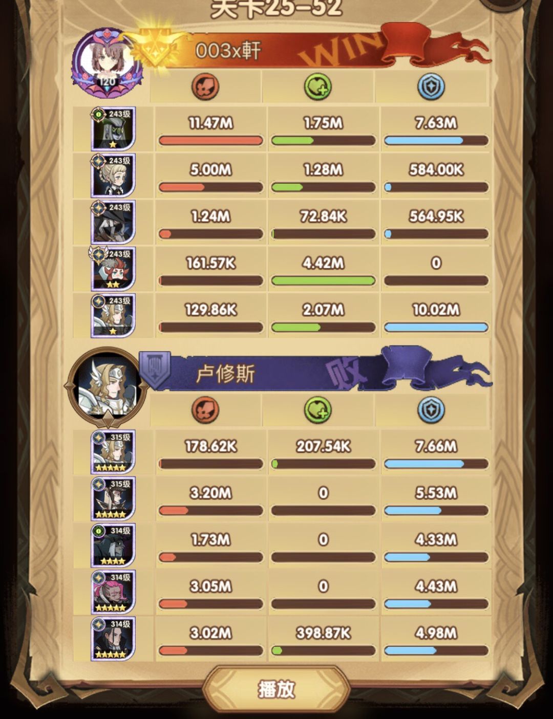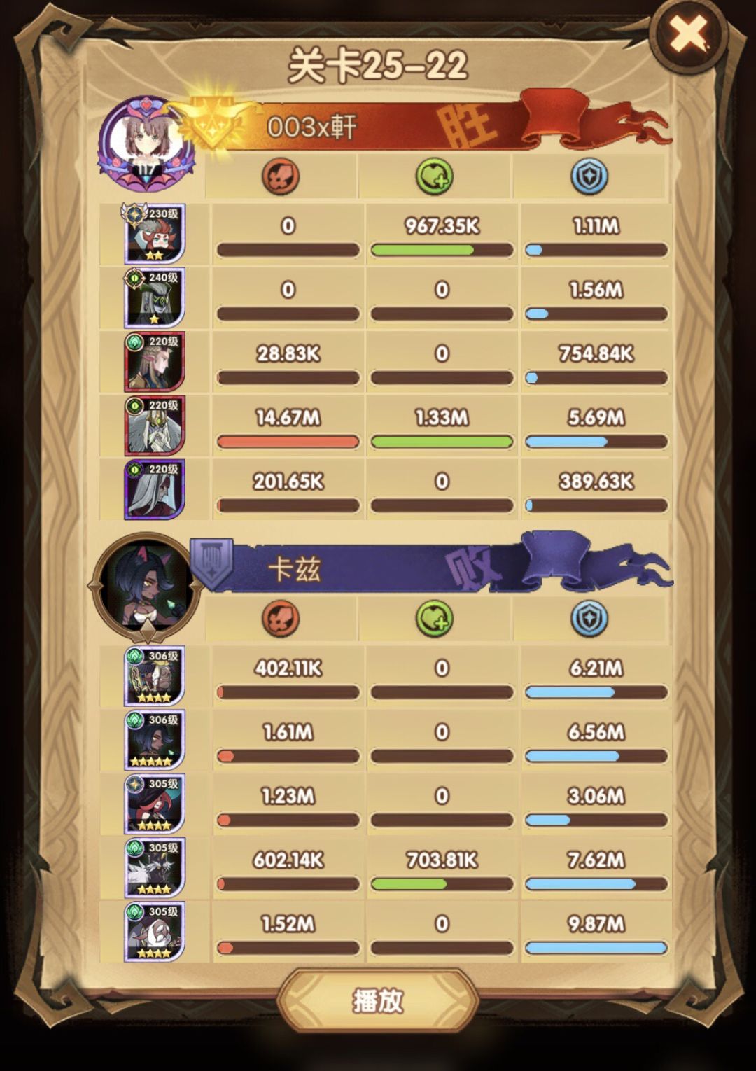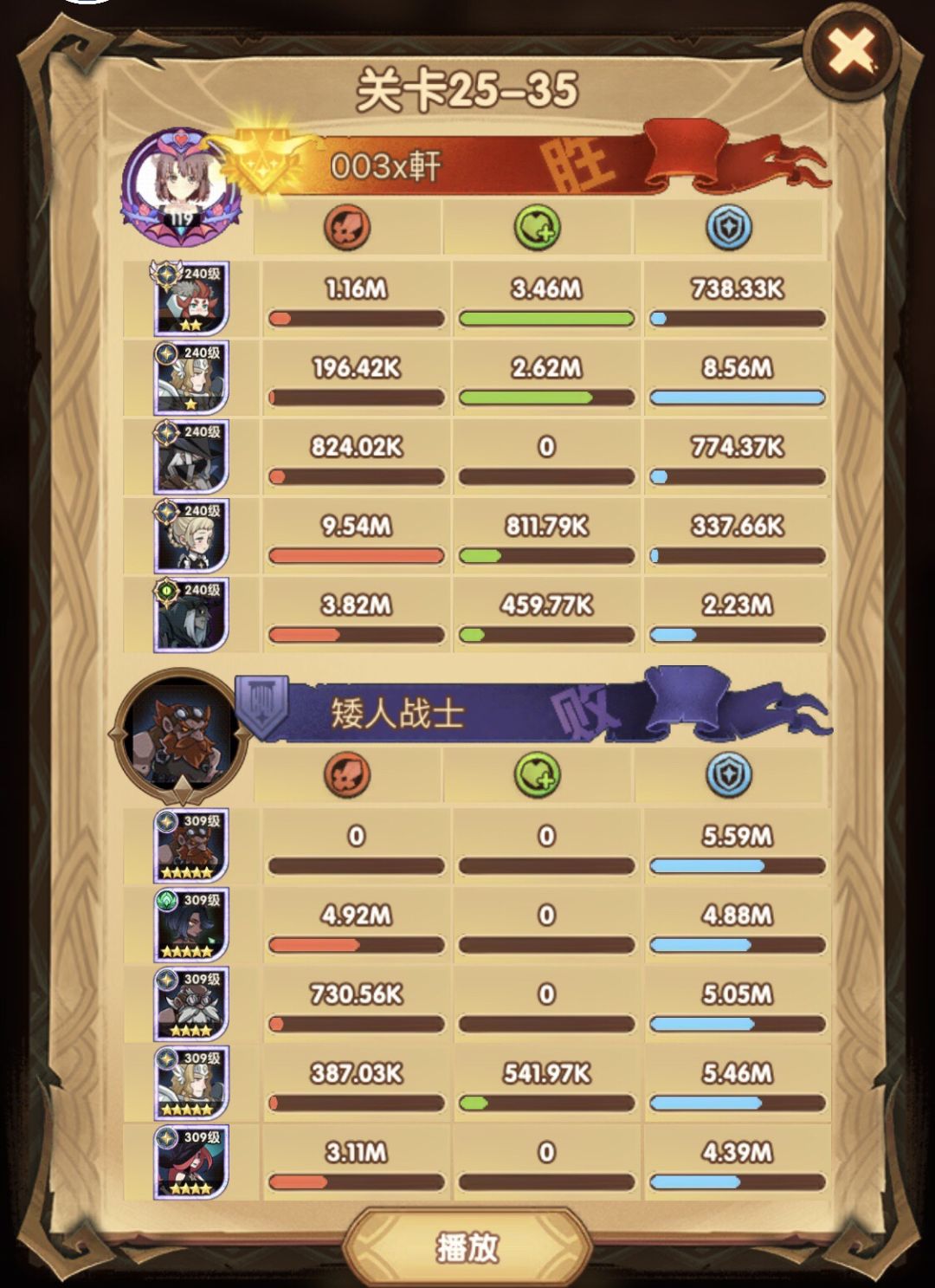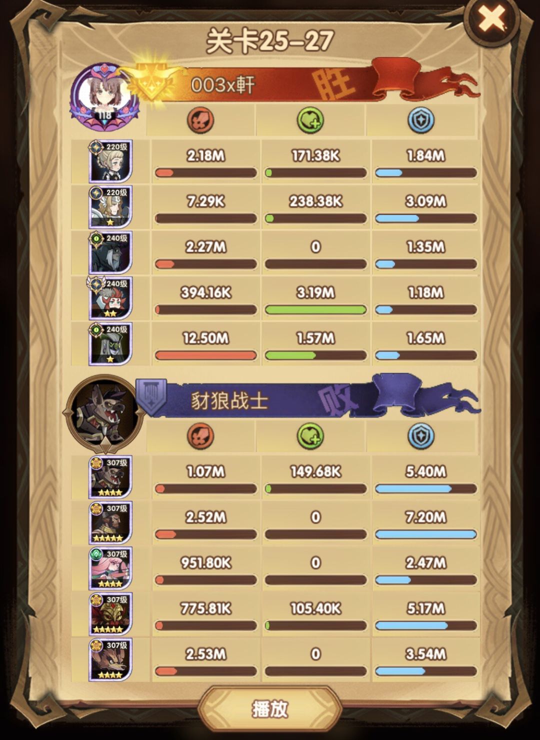 25-46 两天前其实就到全队240,还能升两级的但是我压着等级没升,想试试女妖全队240到底能不能过25章,但re了两三天之后还是只能推到-46,而且也没去更新,女仆也没有+20,女妖的输出真的一言难尽,女妖队,女妖骨弓,骨弓凤凰魅魔,很多方法很多阵容我都试过了并且都re了很久,最好的情况都是差一点点一点点,骨弓是打到时间结束差一点打不死,看的人也是很难受😂,这两天一天平均到8小时的re,甚至于更多,上周末有到十几个小时,所以我真的是尽力了,当然也很有可能是我自身能力不足,但我在我的目前情况下基本是尝试到最极限了,后面就慢慢升级着打了,如果没能达到大家的期望也只能抱歉了,这个头发日渐稀少的楼主尽力了😭