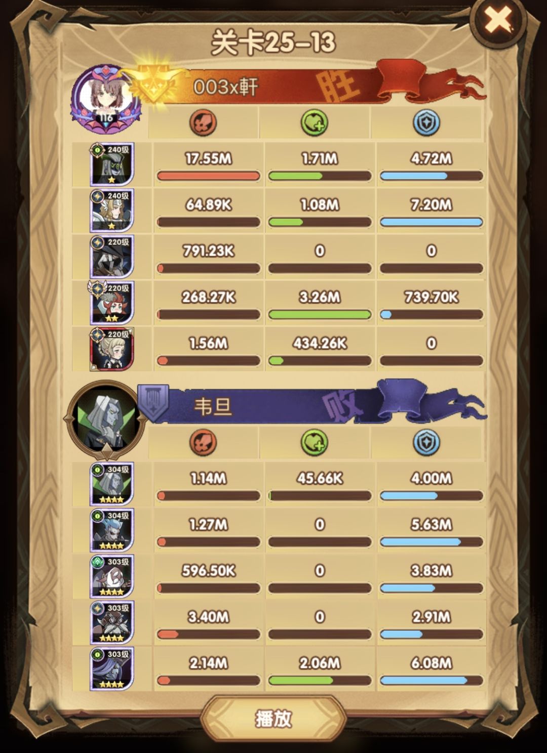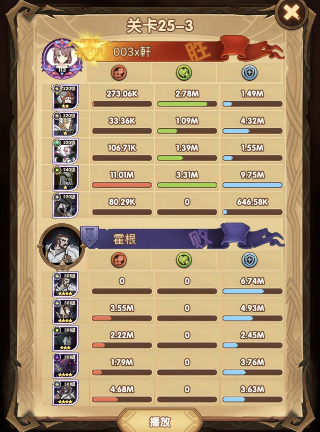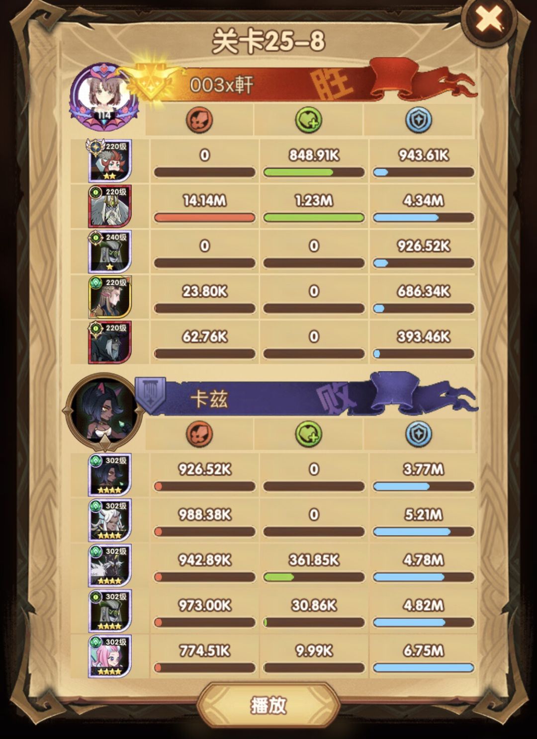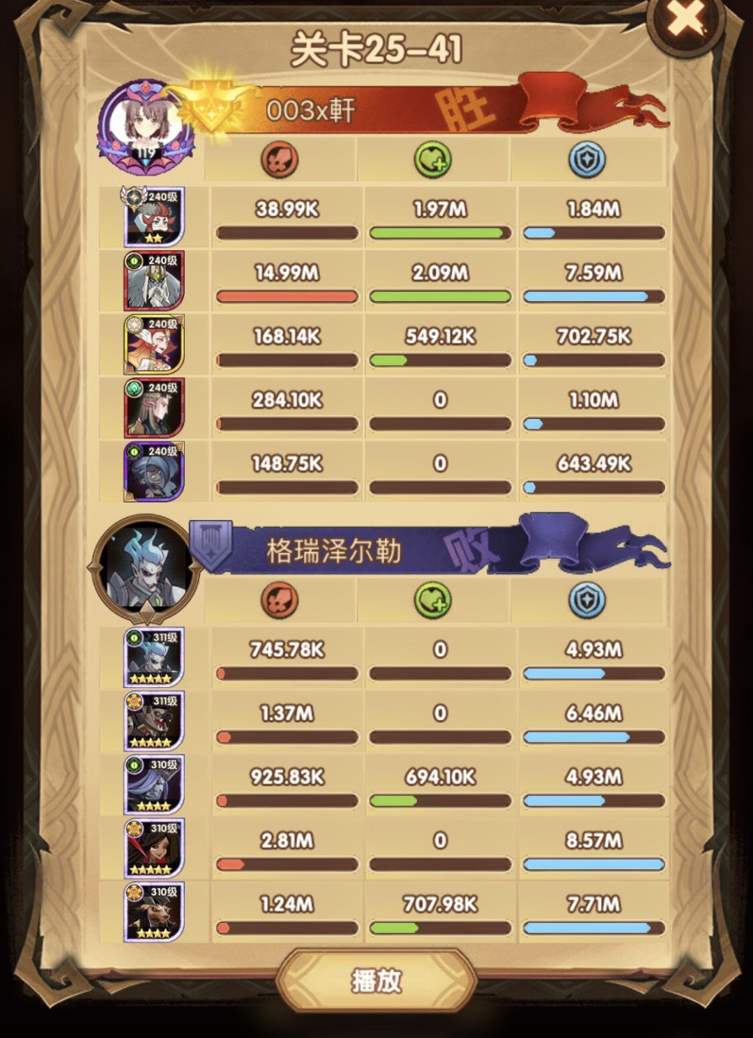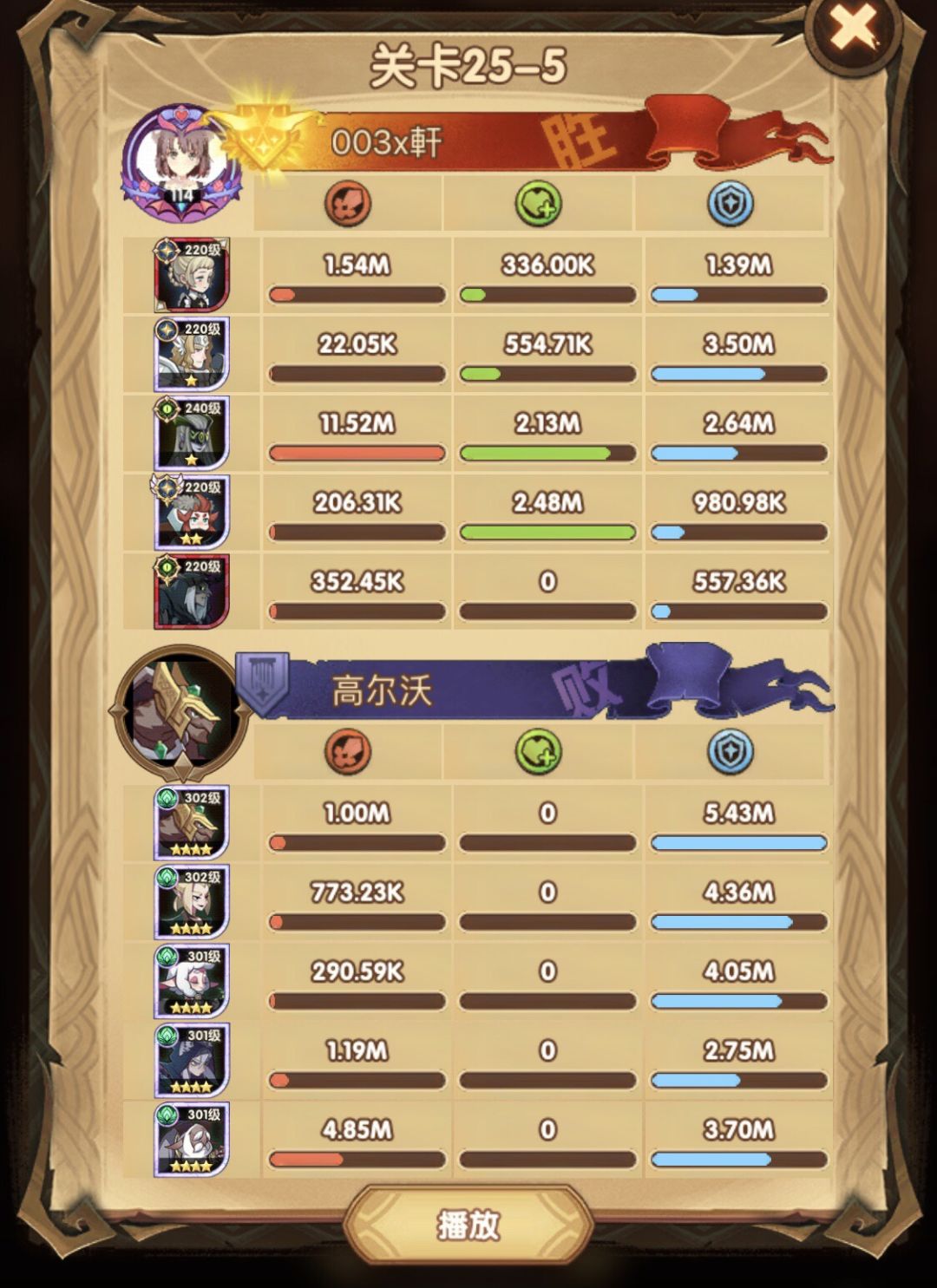 25-46 两天前其实就到全队240,还能升两级的但是我压着等级没升,想试试女妖全队240到底能不能过25章,但re了两三天之后还是只能推到-46,而且也没去更新,女仆也没有+20,女妖的输出真的一言难尽,女妖队,女妖骨弓,骨弓凤凰魅魔,很多方法很多阵容我都试过了并且都re了很久,最好的情况都是差一点点一点点,骨弓是打到时间结束差一点打不死,看的人也是很难受😂,这两天一天平均到8小时的re,甚至于更多,上周末有到十几个小时,所以我真的是尽力了,当然也很有可能是我自身能力不足,但我在我的目前情况下基本是尝试到最极限了,后面就慢慢升级着打了,如果没能达到大家的期望也只能抱歉了,这个头发日渐稀少的楼主尽力了😭