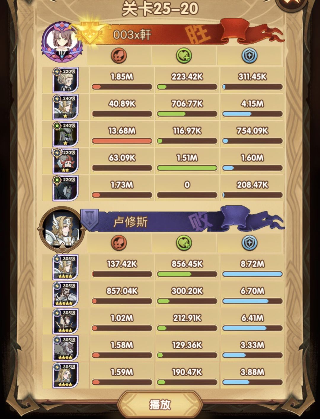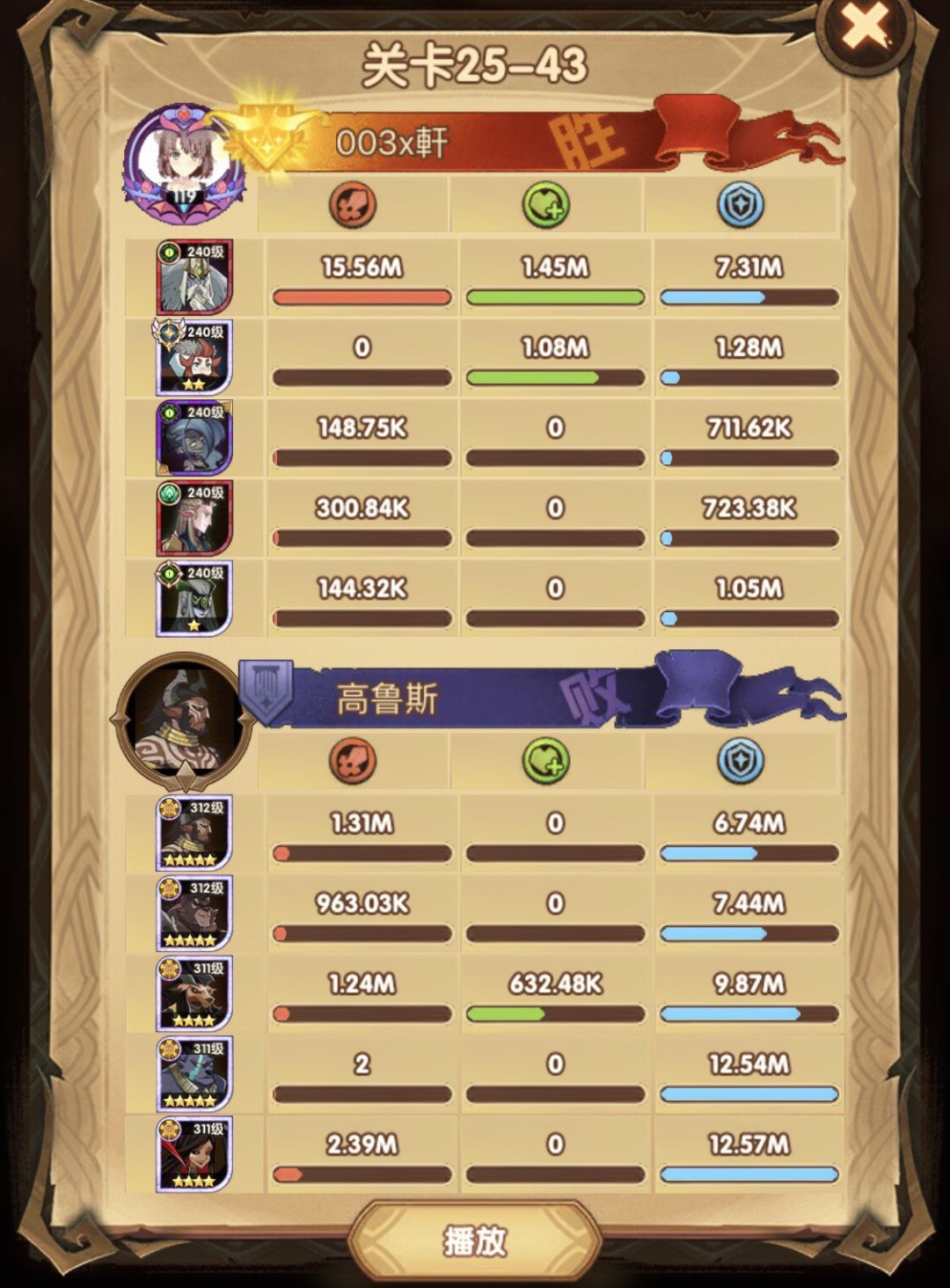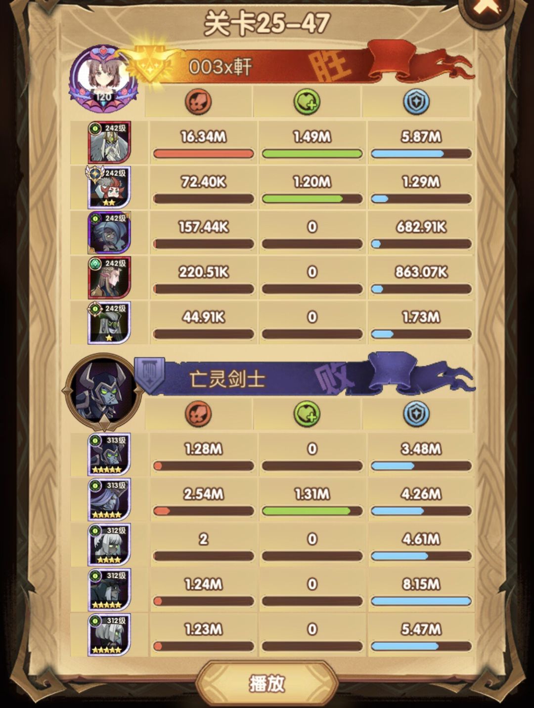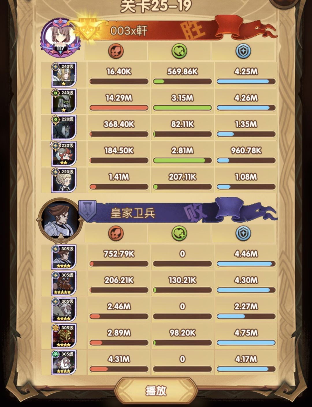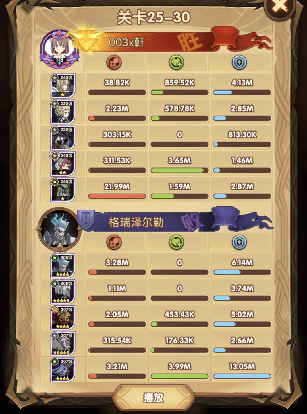 25-46 两天前其实就到全队240,还能升两级的但是我压着等级没升,想试试女妖全队240到底能不能过25章,但re了两三天之后还是只能推到-46,而且也没去更新,女仆也没有+20,女妖的输出真的一言难尽,女妖队,女妖骨弓,骨弓凤凰魅魔,很多方法很多阵容我都试过了并且都re了很久,最好的情况都是差一点点一点点,骨弓是打到时间结束差一点打不死,看的人也是很难受😂,这两天一天平均到8小时的re,甚至于更多,上周末有到十几个小时,所以我真的是尽力了,当然也很有可能是我自身能力不足,但我在我的目前情况下基本是尝试到最极限了,后面就慢慢升级着打了,如果没能达到大家的期望也只能抱歉了,这个头发日渐稀少的楼主尽力了😭