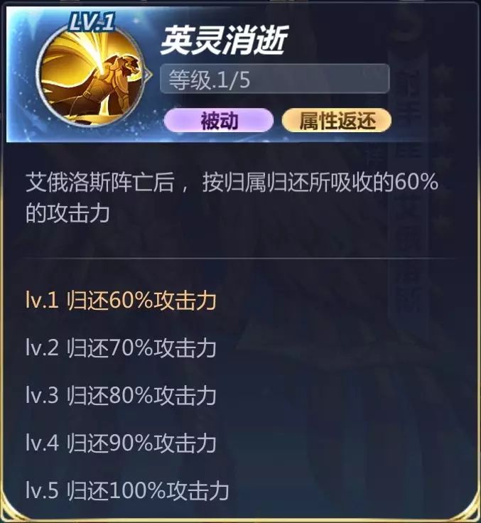 艾俄洛斯阵亡后按照归属归还所吸收的60%(70%/80%/90%/100%)物理攻击力。