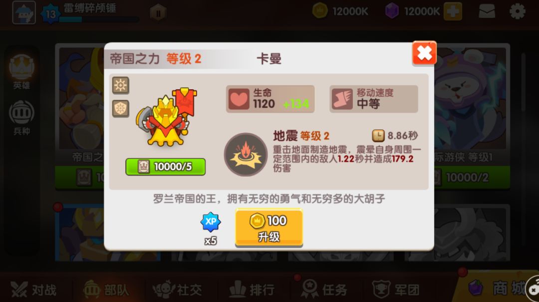 点击任意角色可以查看角色的详细信息,我们也可以消耗一定同名碎片和金币进行升级,升级之后英雄/小兵的生命值、攻击力、技能等等都会得到加强。