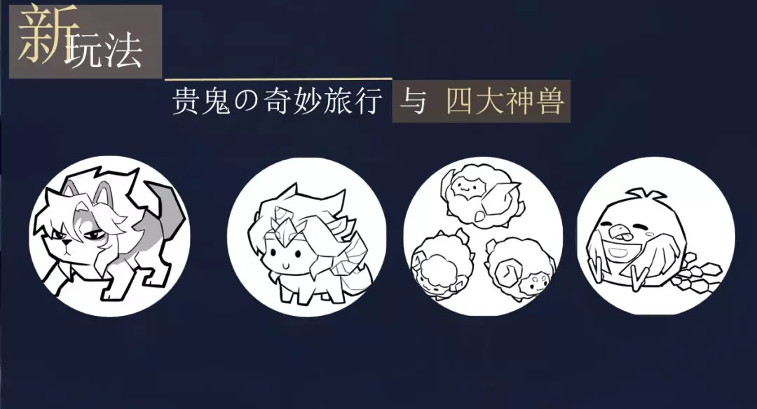 四大神兽形象由玩家对游戏中斗士日常称呼衍生而来,从左至右依次为哈士奇(哈迪斯),神马(神圣衣·星矢),三羊开泰(三代白羊座圣斗士),口水鸡(神一辉),该玩法是在星矢不能死玩法上升级而来,敬请期待!