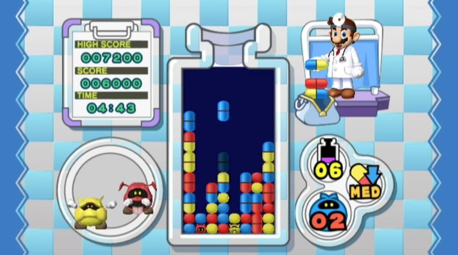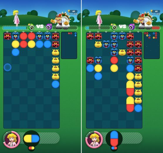 游戏的玩法是让玩家扮演马力欧医生,把三色胶囊扔到瓶子里消除病毒,同样是下落式消除,采用的却是三色同线即可消除的模式。加上轻松的BGM和多人PK玩法,在轻松游玩中也有着益智的魅力。