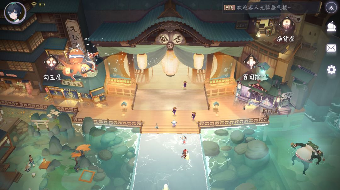 下层:在下层区域,“百闻馆”是购买和开启秘卷的地方,而“勾玉屋”“杂货屋”是钱币和货物交易兑换的地方。
