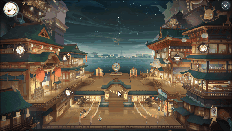 游戏的主场景是“蜃气楼”,我们进入游戏看到的是整个“蜃气楼”的中间一层,上下还各有一层,这三个场景其实是一体的,通过上下滑动就可以切换,每层场景都有着不同功能,玩法也各不相同。