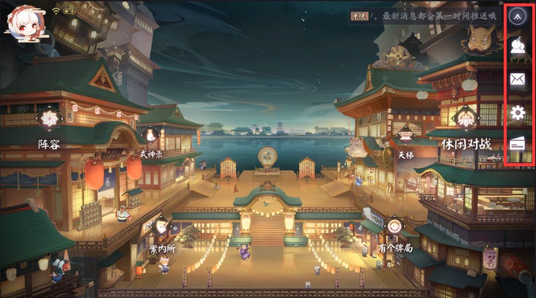 中层:很多重要内容都集中在这里,“式神录”可以了解式神和卡牌的特性;“阵容”是组建卡组的地方;“案内所”的主要功能有新手试炼和每日任务;“休闲对战”、“有个牌局”、“天梯”分别是娱乐对局和排位上分的地方。