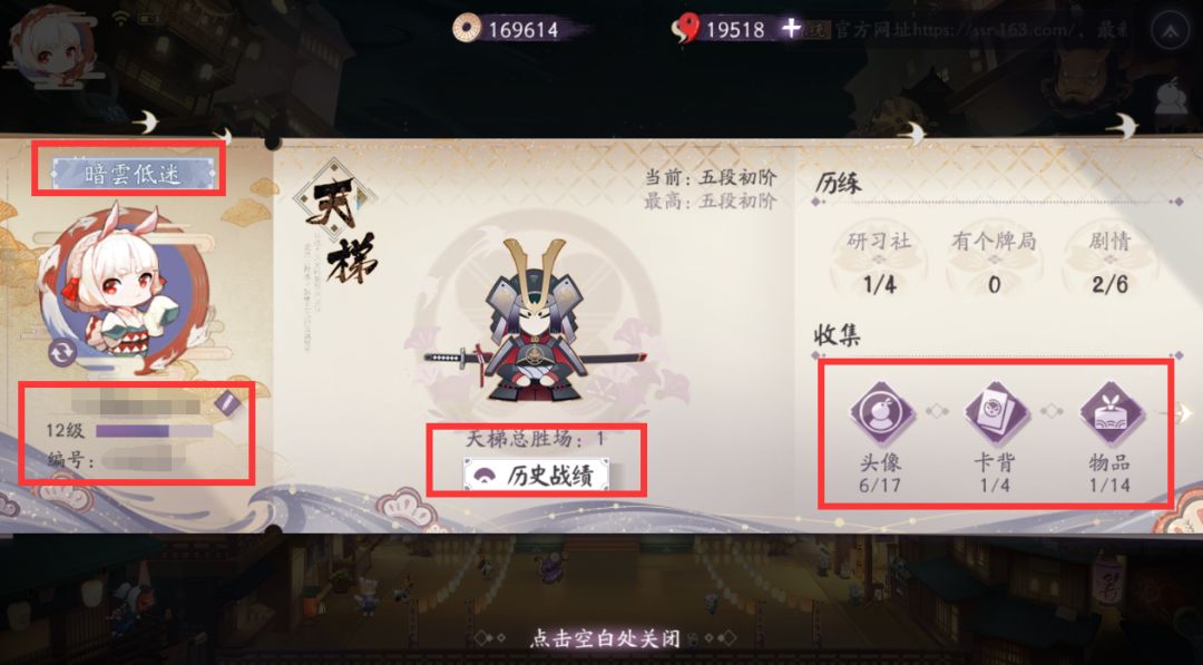 进入游戏后点击左上角的“头像”,进入到个人属性页面,点开后我们可以看到这里有自己的昵称、编号等基本信息,也能看到自己的战绩统计,以及玩家所收集到的物品,相当于背包一样。在中间右上角的位置是玩家的段位显示,然后想要关闭的话就在任意空白处点击一下就可以了。