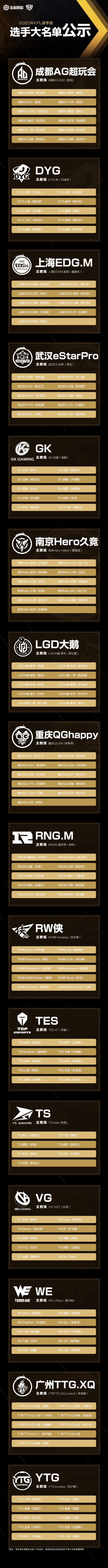 【2020KPL春季赛完整选手大名单】