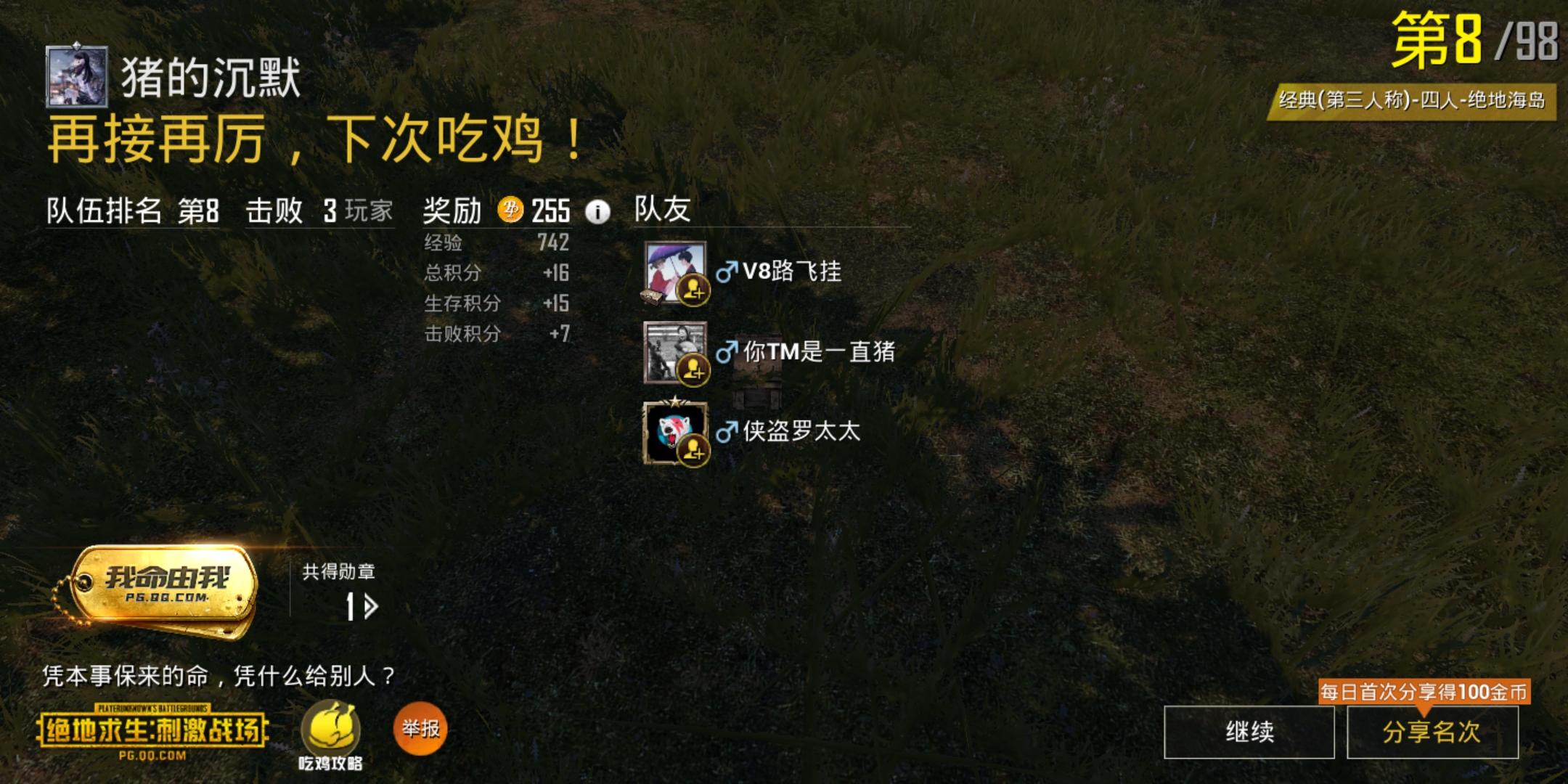 最后网卡了,死在毒圈,我们发现,一把加16分。很nice。 第一次写刺激攻略,还请大家见谅。