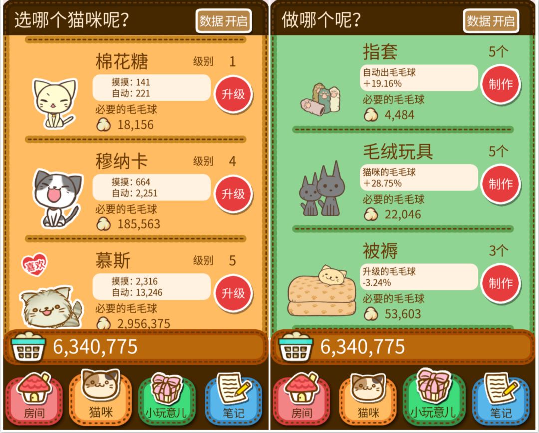 收集了一堆猫毛后我们就可以愉快的换取新猫来撸了,猫越换能撸的毛就越多,自动产出的毛也越多,而想看下一只猫长什么样的信念会一直支撑你通关,是的,就是这么魔性,毕竟我们都是好奇宝宝。收集的猫毛不仅可以解锁新猫,制作一些小玩意儿也是游戏的特色之一,这些小道具总结起来就是花最少的钱,攒更多的毛。制作新的小玩意后可以解锁日记,游戏也细心的帮我们记录了和猫咪在一起的时光,感觉也在提醒着我们的手速……