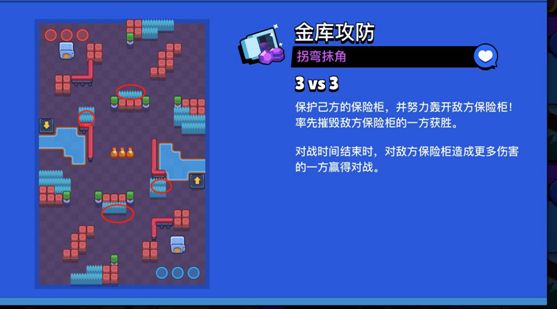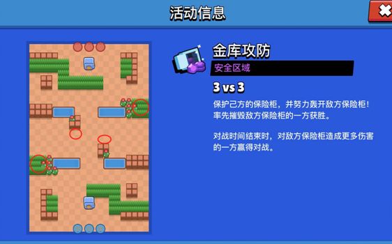 进入此种类地图尽量搭配远程射击能力优秀的乱斗英雄,开局抢占途中红圈位置,利用墙体掩护输出敌方英雄,大招能量蓄满后找准机会轰开各类防护墙,再利用射程优势消耗敌方保险柜血量,累积优势取得胜利。