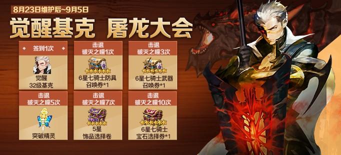 活动时间:8月23日维护后—9月5日,活动期间骑士使用【觉醒基克】进行签到以及参与击退破灭之瞳,达到规定次数即可获得对应的奖励
