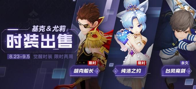 8月23日维护后—9月5日,时装商城上架基克【胡克船长】、尤莉【纯洁之约】觉醒时装;同时基克【台风魔剑】时装将永久销售