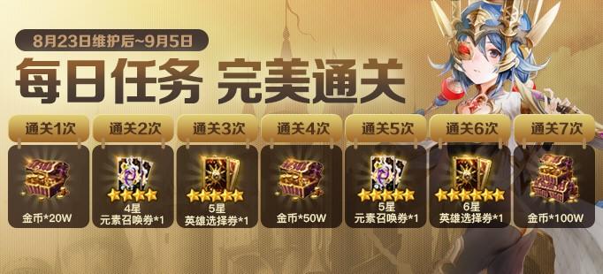 活动时间:8月23日维护后—9月5日,活动期间完成一定次数的每日任务即可获得对应的奖励