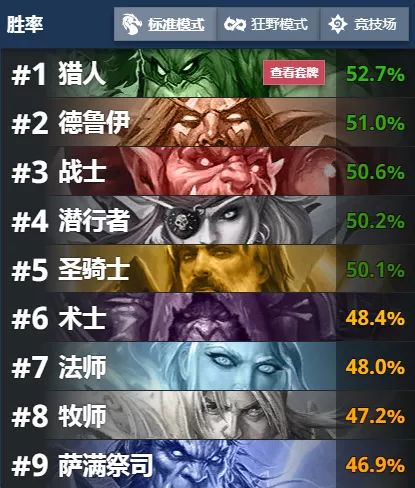 这不,天梯段位更新的第一天各职业胜率已经出来了,猎人独占鳌头,标准第一位传说也是猎人的宇宙猎卡组。相信今天标准天梯冲分的,也没少遇见猎人吧,反正我是遇见了一大堆快攻龙猎。