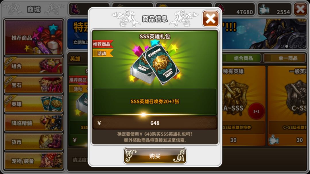 -核心礼包:SSS级英雄x5+SSS精髓指定券250个(原本200个)