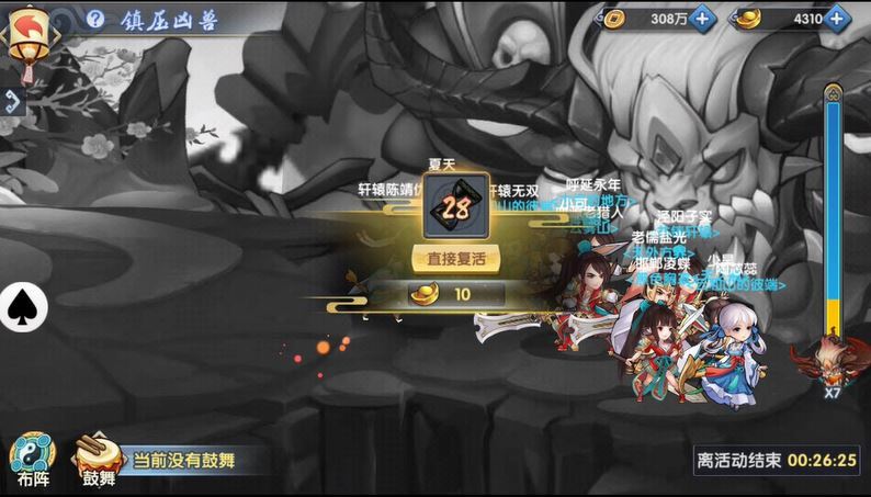参与镇压凶兽的过程中,团灭是很正常的事情,队伍扑街后需要等待30秒才能再次进行挑战,当然也可以支付10元宝复活团队,继续与凶兽战斗。这里要告诉大家的另一个小技巧是:不要吝啬那10元宝。如果不花元宝,等复活时间,顶多打两轮,凶兽就已经被全服玩家打没血了。增加一次挑战凶兽的机会,对于提升自己在输出榜的名次作用非常大,最后获得的收益也远大于复活的元宝。
