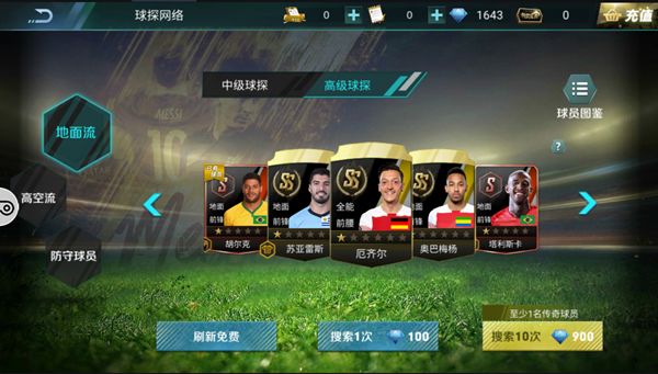 高级球探:分为地面流、高空流、防守型、玩家可任意选择自己需要的类型进行抽奖,如该类型中无你需要的球星还可以免费进行刷新,每次刷新重置时间为一个小时,高级球探卡可在副本、日常登入、大师联赛、成就馆里获得,钻石探索10次必得SS级球星哦。