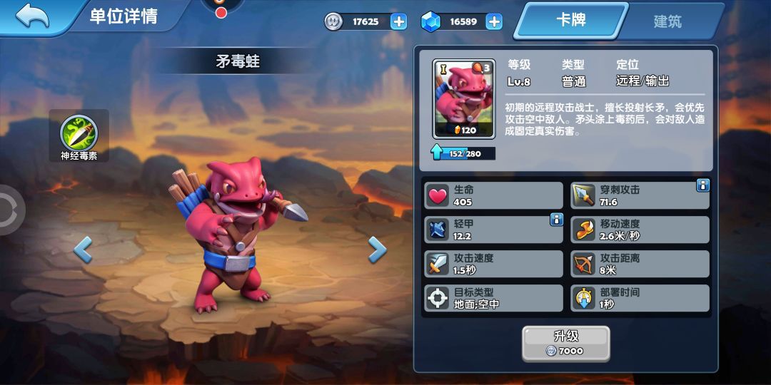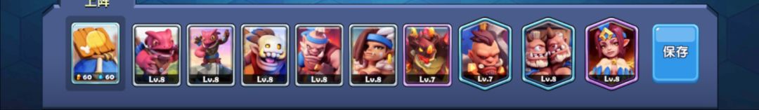 兵种:矛毒蛙(远程输出)+箭塔(防御塔)+巫医(奶妈)+掷斧手+萨满+熔岩巨兽(肉坦)